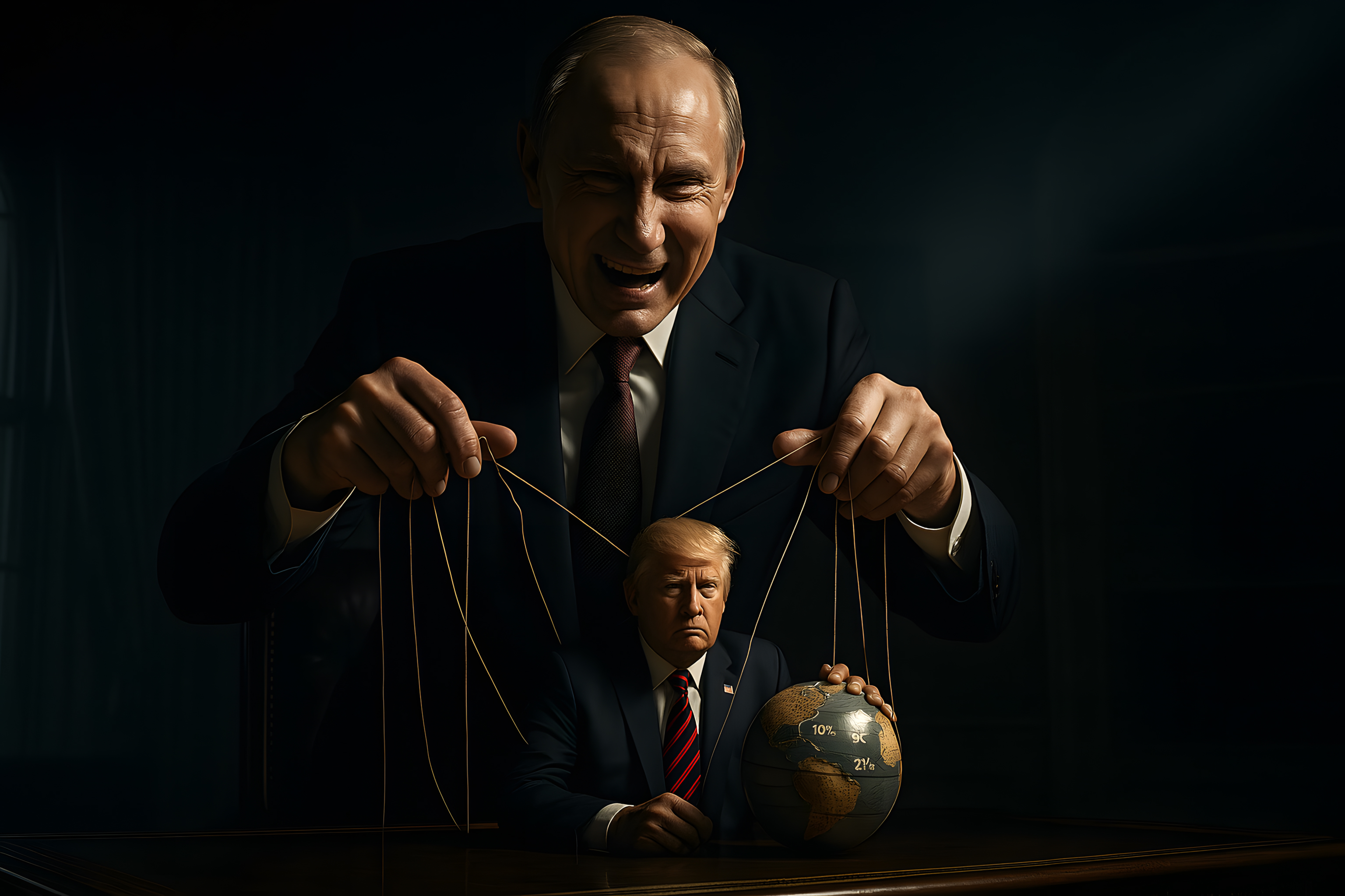 Das Bild zeigt den russischen Präsidenten als mächtigen Strippenzieher, der die Geschicke der Welt, repräsentiert durch eine Erdkugel, wie eine Marionette kontrolliert. Mit ernster Miene und in dunkler Umgebung sitzt er am Tisch, die Fäden in seinen Händen haltend, die an der Erdkugel befestigt sind. Diese dramatische Darstellung vermittelt den Eindruck von Macht, Einfluss und Manipulation auf globaler Ebene.