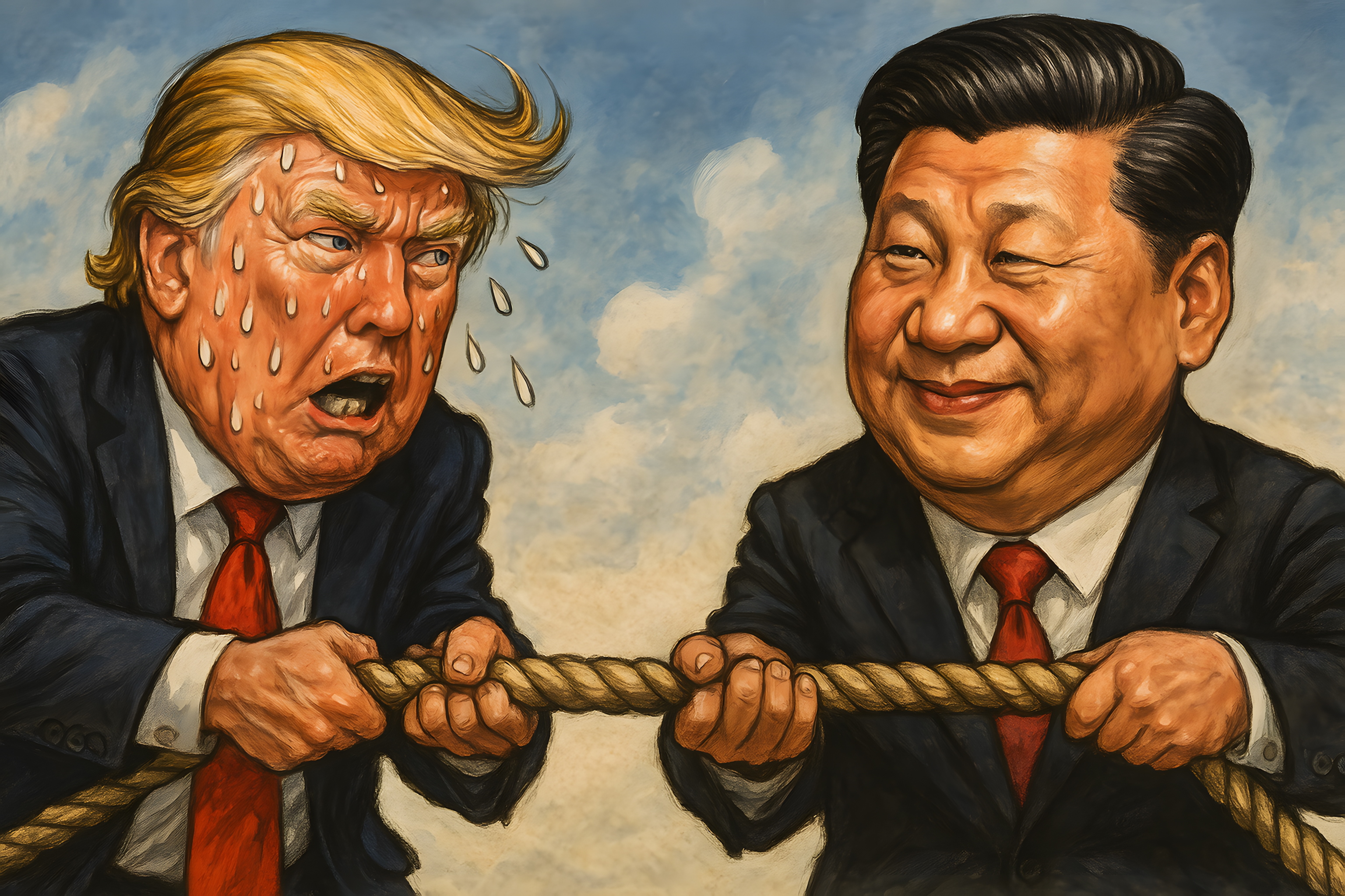Das Bild zeigt eine Karikatur, die den Machtkampf zwischen den Staatsoberhäuptern Donald Trump und Xi Jinping darstellt. Die beiden Männer sind in Anzügen gekleidet und ziehen an einem Seil, um ihre Dominanz auszuspielen. Trumps Gesichtsausdruck zeigt Anstrengung und Wut, während Jinping ruhig und überlegen wirkt. Die Darstellung spiegelt den aktuellen Handelskrieg zwischen den USA und China wider und visualisiert den Konflikt auf eindrucksvolle Weise.