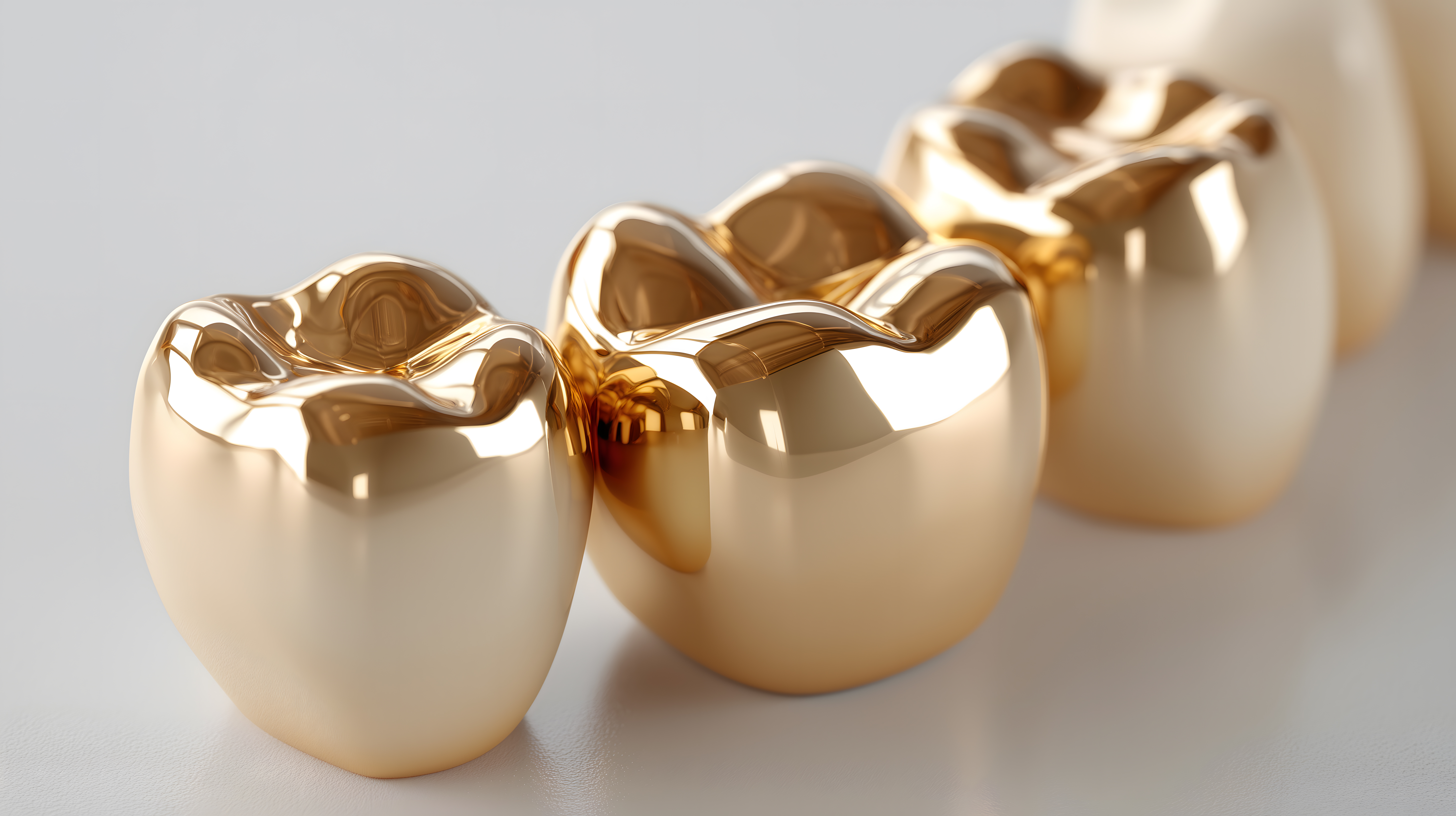 Diese Nahaufnahme zeigt eine Reihe von glänzenden, goldenen Zahnkronen vor einem weißen Hintergrund. Die Kronen sind detailliert und perfekt poliert, was einen luxuriösen und hochwertigen Eindruck vermittelt. Dieses Stockfoto eignet sich hervorragend für Websites, Blogs oder Werbematerialien im Bereich der Zahnmedizin, Dentalbranche oder im Zusammenhang mit Gesundheit und Wellness. Es ist in hoher Auflösung verfügbar und kann unter den Bedingungen der Creative Commons-Lizenz kostenlos genutzt werden.