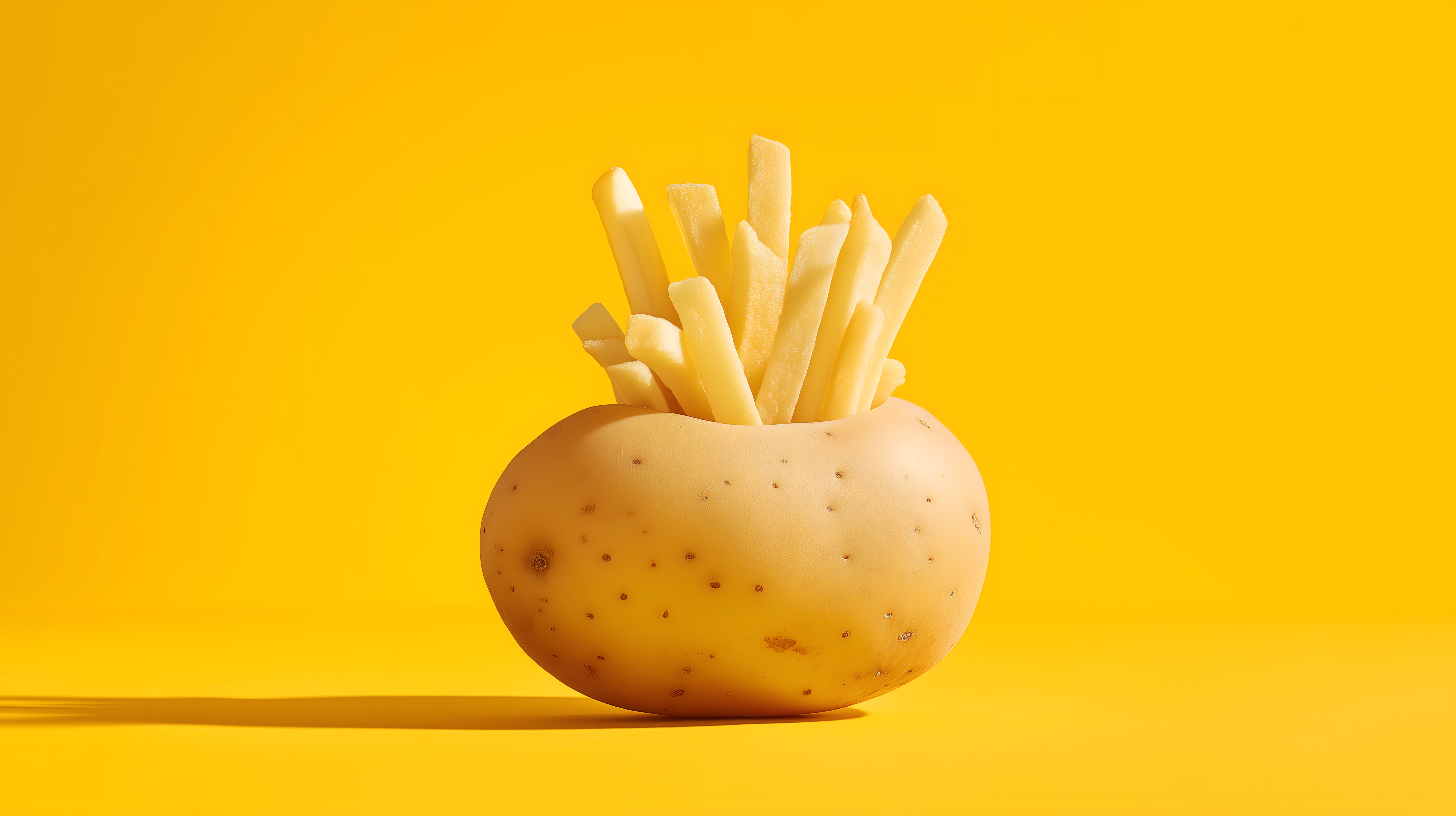 Dieses Foto zeigt eine knusprig aussehende Portion Pommes Frites, die in einer rustikal aussehenden Kartoffel präsentiert werden. Der einfarbig gelbe Hintergrund lenkt den Blick direkt auf das Motiv und lässt es in einem modernen, minimalistischen Stil erscheinen. Die Aufnahme vermittelt einen appetitlichen Eindruck und lässt sich ideal für Beiträge in Lifestyle-Blogs, Rezeptsammlungen oder Werbekampagnen im Bereich Fastfood und Snacks einsetzen. Dieses hochaufgelöste Stockfoto steht unter der Creative Commons-Lizenz zur kostenlosen Verwendung zur Verfügung.