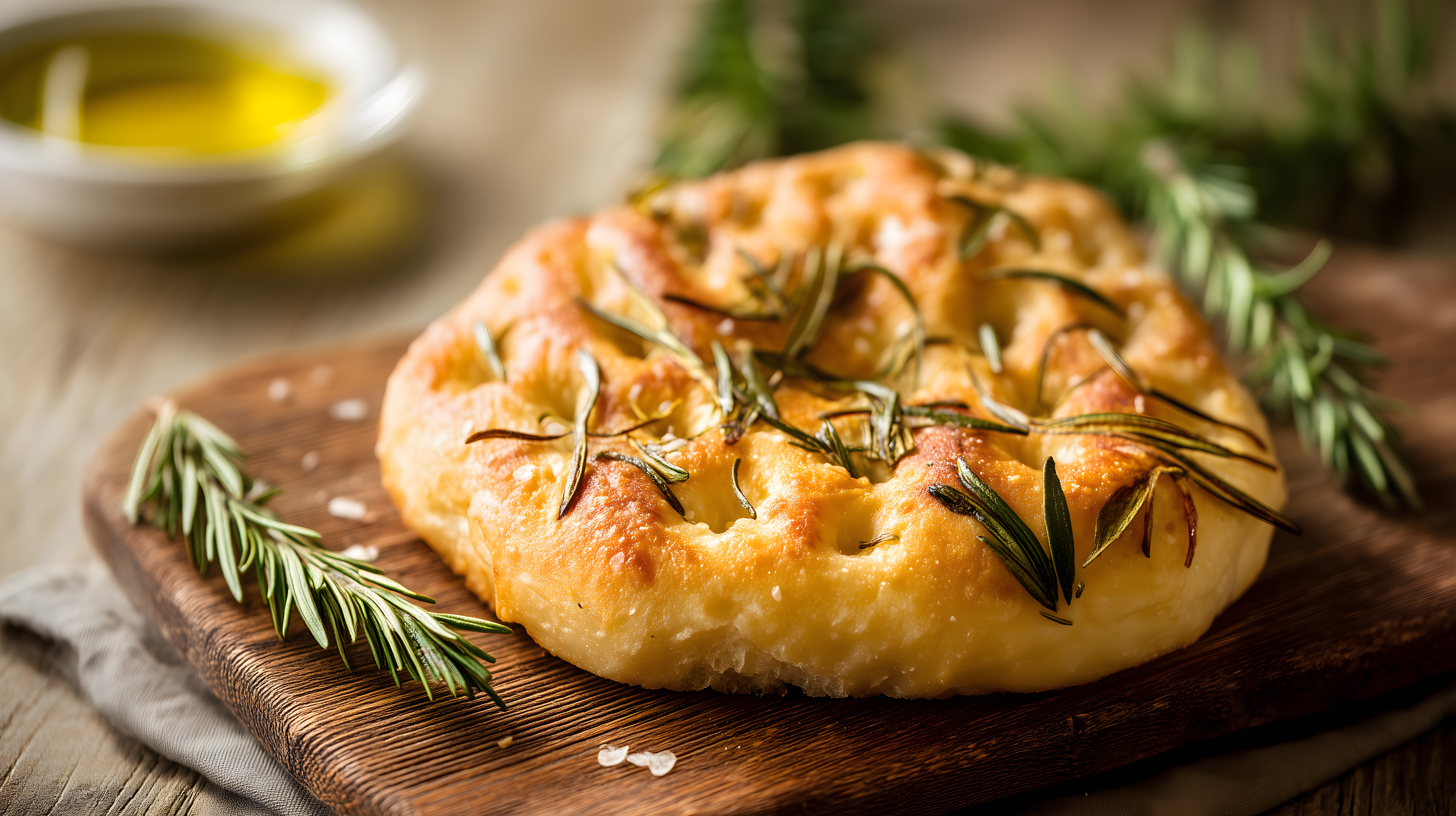 Dieses köstliche Foto zeigt eine frisch gebackene Focaccia, belegt mit knusprigen Rosmarin-Zweigen. Das goldbraune Brot liegt auf einem rustikalen Holzbrett, umgeben von einigen Rosmarin-Blättern. Im Hintergrund ist eine gelbe Schale mit Olivenöl zu sehen, die dem Gericht den letzten Schliff verleihen könnte. Die Aufnahme besticht durch ihre appetitliche Optik, die natürliche Beleuchtung und den stilvollen, rustikalen Charakter. Dieses hochauflösende Stockfoto eignet sich perfekt für Blogs, Newsletter, Social-Media-Beiträge oder Werbung rund um Backen, Kochen und italienische Küche. Es steht unter einer kostenlosen Creative-Commons-Lizenz zur Verfügung.