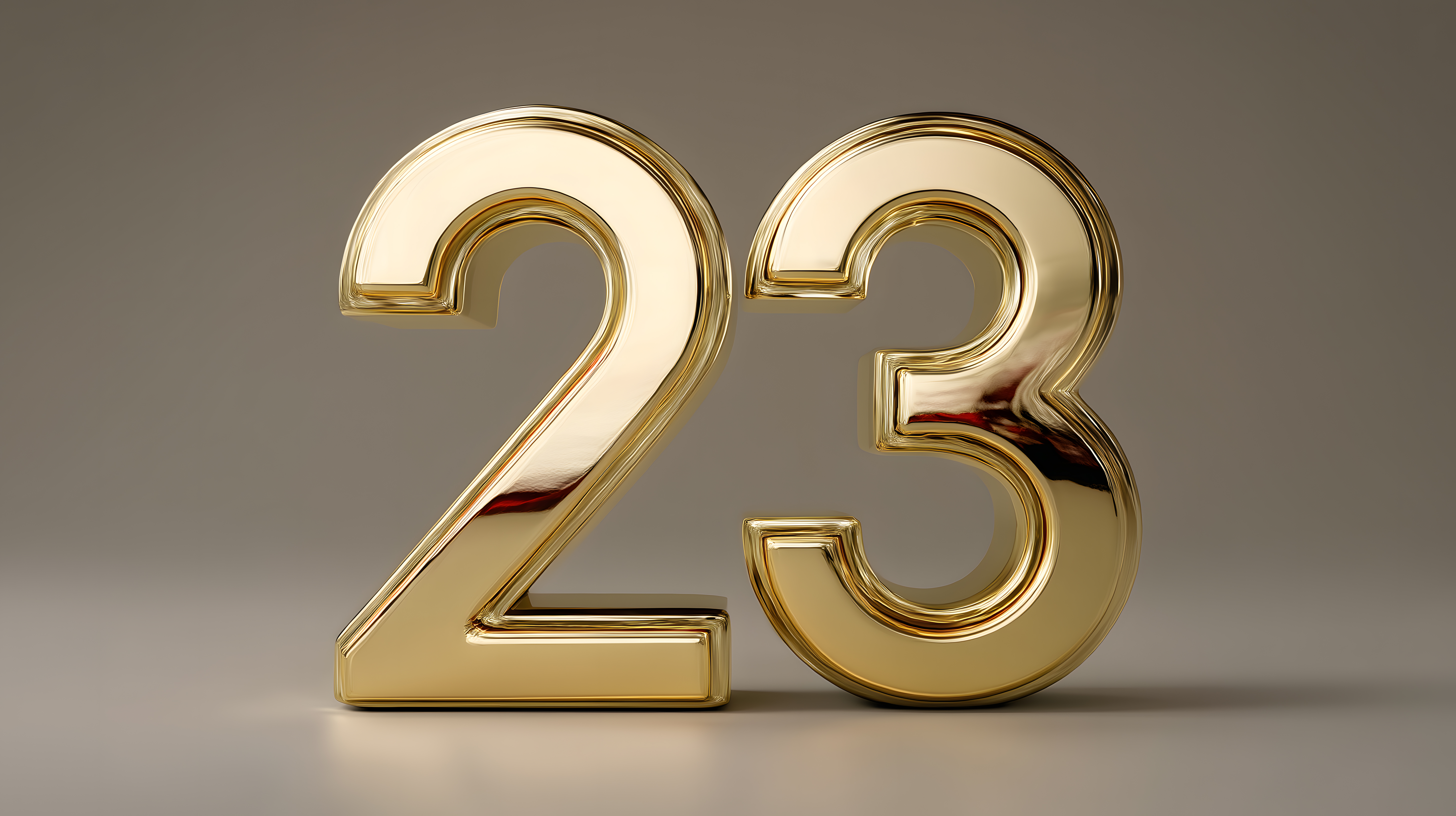 Dieses Stockfoto zeigt zwei goldfarbene, dreidimensionale Zahlen '23' vor einem neutralen, grauen Hintergrund. Die Zahlen haben einen hochglänzenden, metallischen Look, der durch das indirekte Studiostudio-Licht betont wird. Die Komposition ist minimalistisch und elegant, was das Foto für eine Vielzahl von Anwendungen wie Werbung, Webdesign, Präsentationen oder Illustrationen einsetzbar macht. Als hochwertiges Stockfoto in hoher Auflösung unter der Creative Commons-Lizenz ist es kostenfrei für kommerzielle und private Zwecke nutzbar.