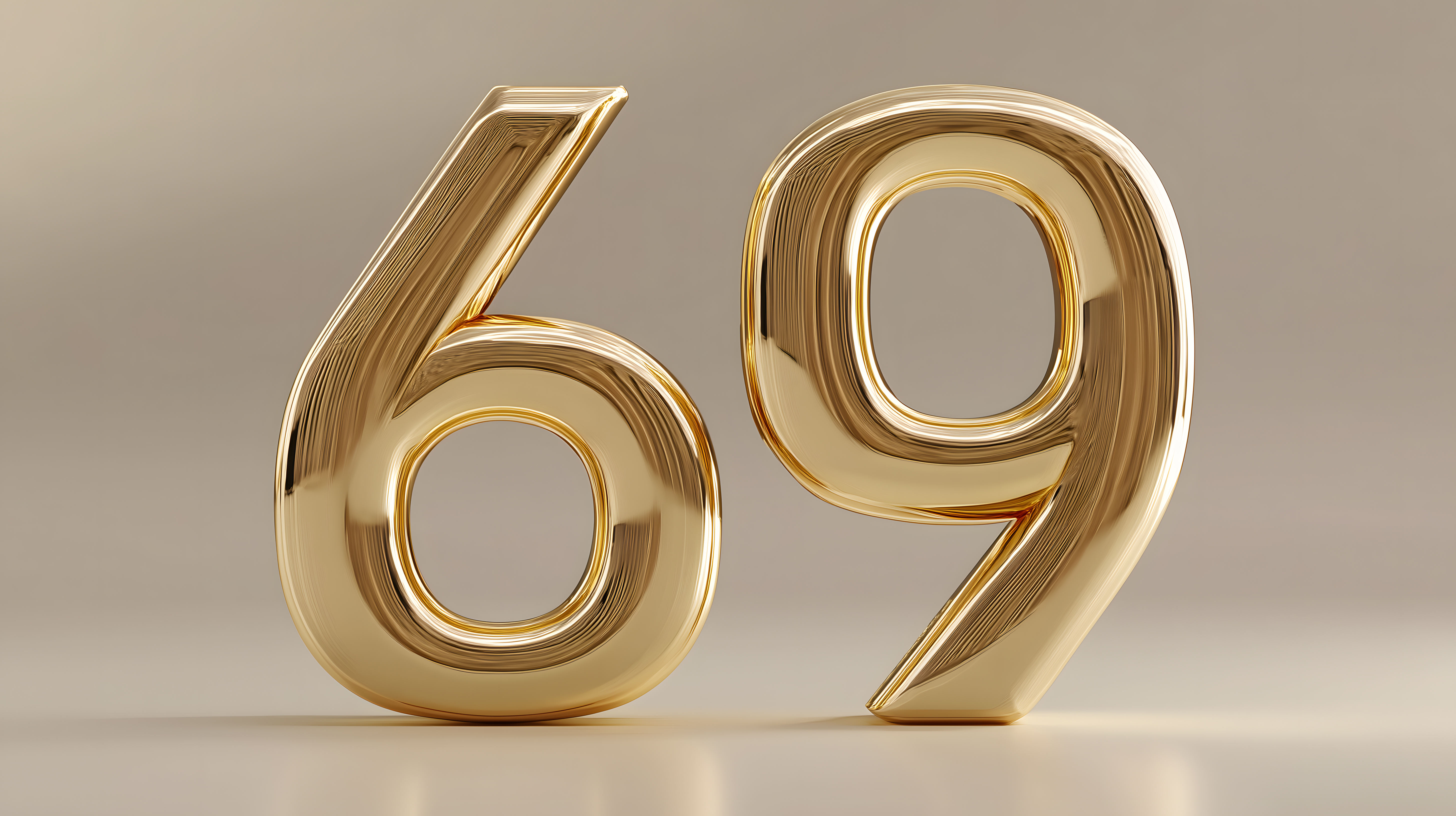 Dieses hochwertige Stockfoto zeigt zwei goldene, dreidimensionale Zahlen '69' auf einem hellbraunen Hintergrund. Die Zahlen sind detailliert und fotorealistisch dargestellt, mit einer glatten, glänzenden Oberfläche, die einen luxuriösen, eleganten Stil erzeugt. Das Bild eignet sich hervorragend für den Einsatz in Werbung, Blogs, Social Media-Posts oder Newslettern, wo eine hochwertige, visuelle Darstellung von Zahlen, Typografie oder Luxus gefragt ist. Dieses Foto steht unter der Creative-Commons-Lizenz und kann kostenlos in hoher Auflösung verwendet werden.