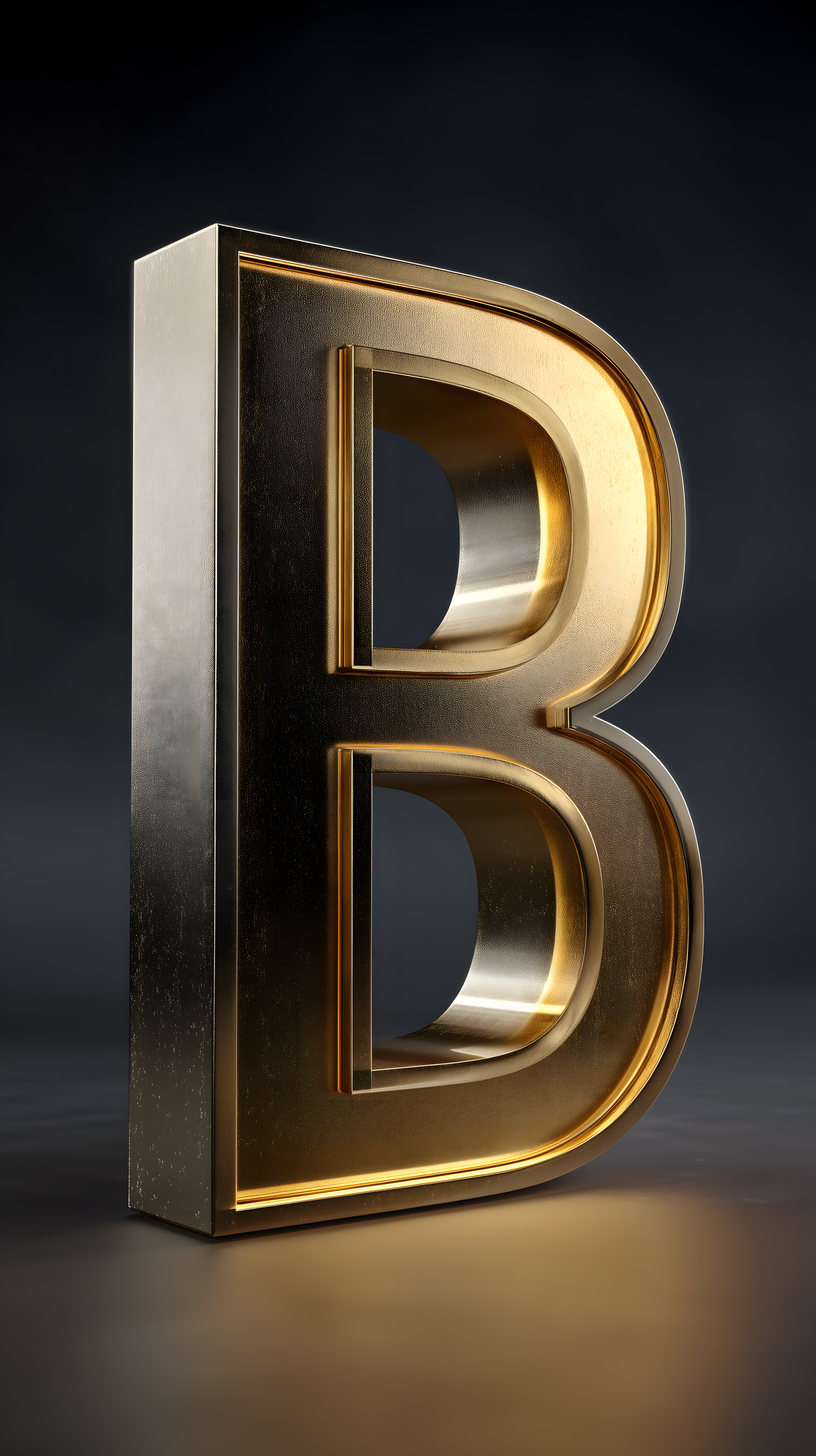 Das Bild zeigt einen in Hochformat aufgenommenen, glänzenden Buchstaben B, der aus Metall gefertigt ist. Der Buchstabe leuchtet in einem warmen, goldenen Ton, der in starkem Kontrast zu dem dunklen, schwarzen Hintergrund steht. Die Oberfläche des Metallbuchstabens ist poliert und reflektiert das Licht auf eine edle, luxuriöse Art und Weise.