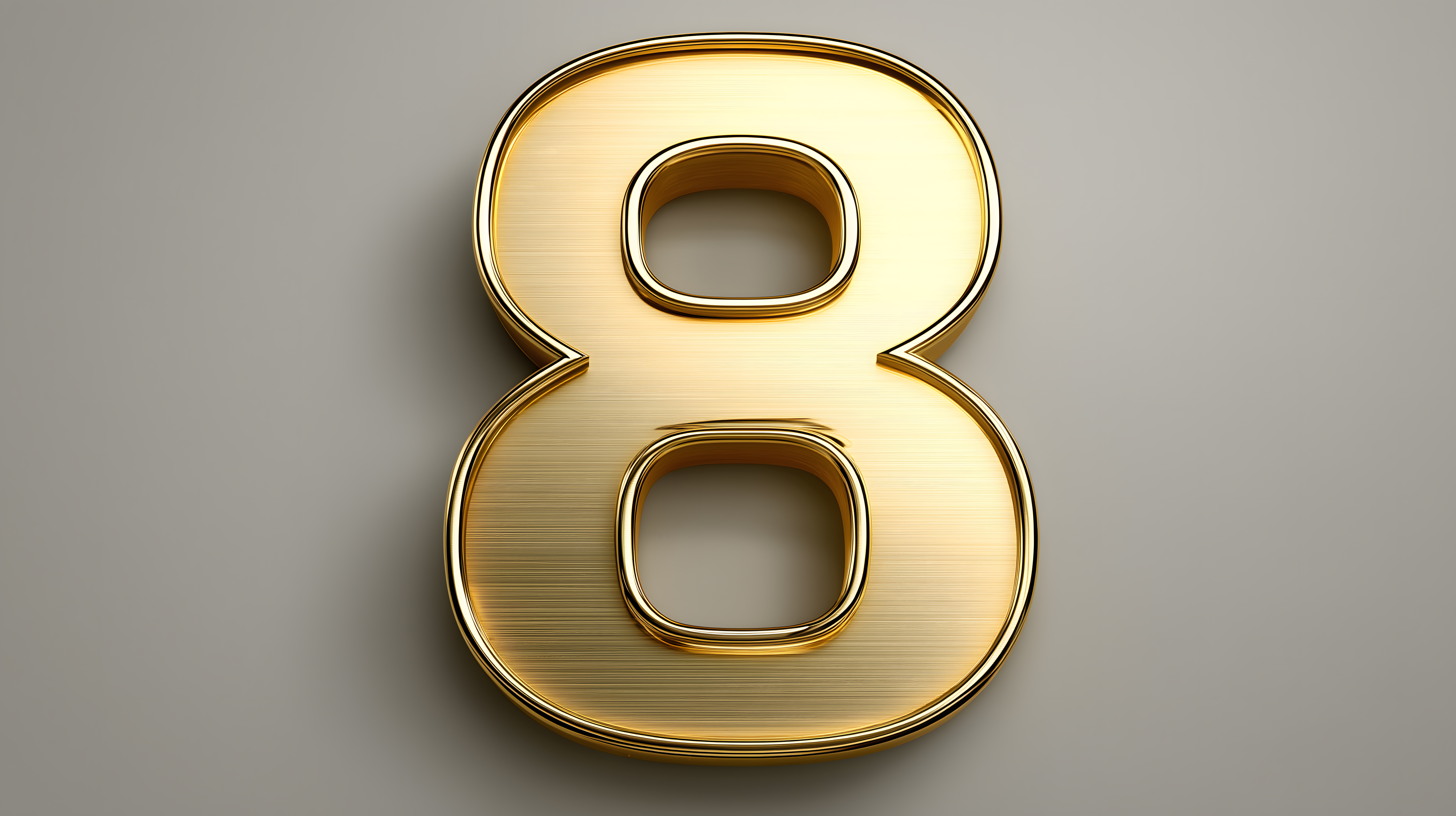 Dieses hochwertige Stockfoto zeigt eine goldene, dreidimensionale Zahl 8 vor einem grauen Hintergrund. Die Oberfläche der Zahl ist matt und glänzend, was dem Motiv eine elegante und minimalistische Ausstrahlung verleiht. Die Darstellung der Acht in reinem Goldton verleiht dem Bild eine besondere Symbolkraft und Ausstrahlung.