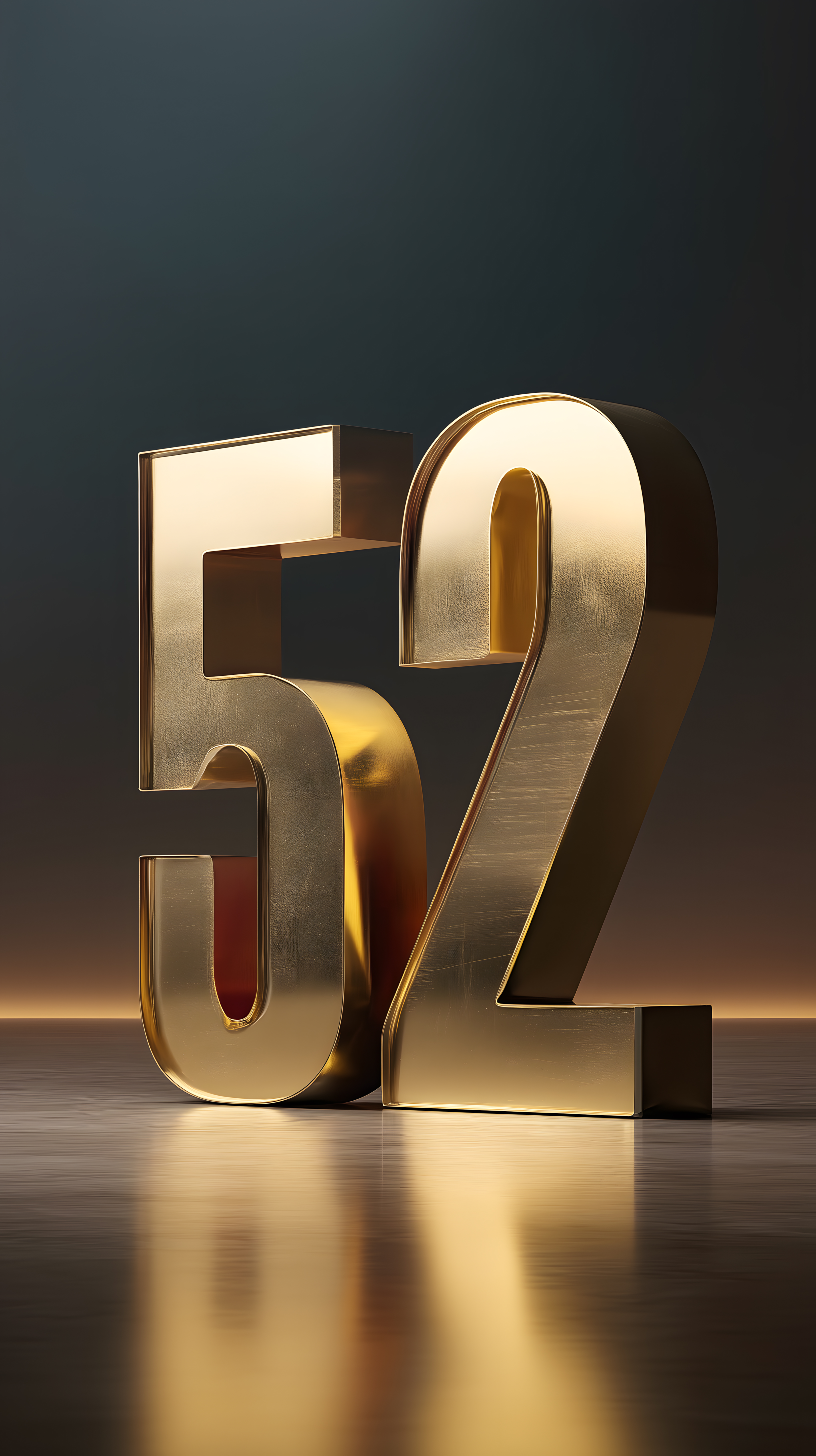 Diese beeindruckende Metallskulptur zeigt die Zahl 52 in einer eleganten, goldenen Optik auf einem dunklen Hintergrund. Das Bild strahlt Eleganz, Größe und Präsenz aus und wäre ideal als Werbegrafik, Titelbild oder Illustration für Jubiläen, Geburtstage oder andere Feierlichkeiten geeignet. Das hochwertige Stockfoto ist in hoher Auflösung und unter einer Creative-Commons-Lizenz frei nutzbar.