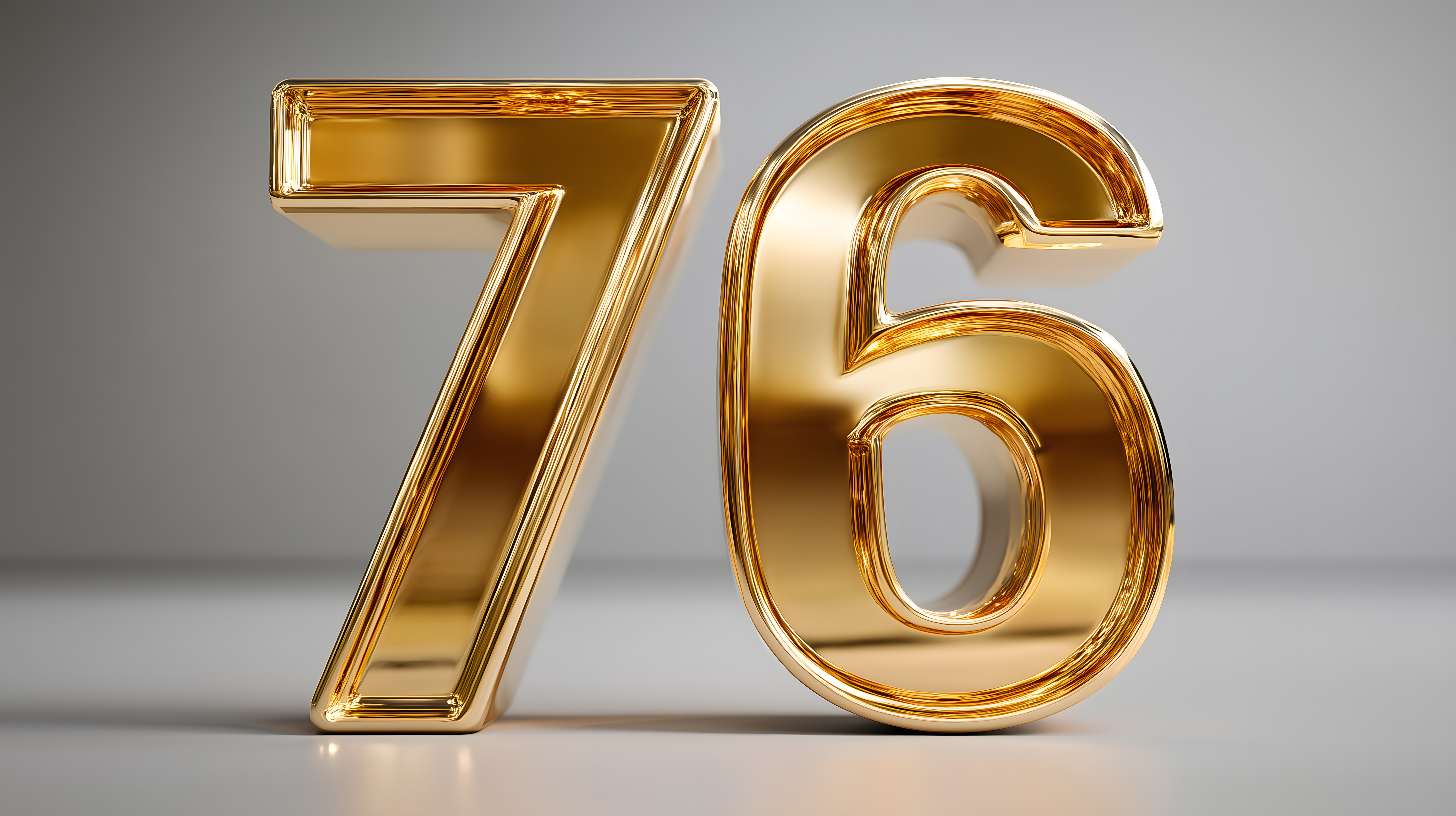 Dieses Bild zeigt eine goldene, dreidimensional wirkende Zahl '76' vor einem grauen Hintergrund. Die Zahl ist detailliert modelliert und strahlt einen edlen, luxuriösen Glanz aus. Das Foto eignet sich ideal für den Einsatz in Werbung, Präsentationen, Blogs oder sozialen Medien rund um Themen wie Jubiläen, Geburtstage oder Jahresrückblicke. Als hochwertiges, frei verwendbares Stockfoto in hoher Auflösung bietet es vielfältige Gestaltungsmöglichkeiten.