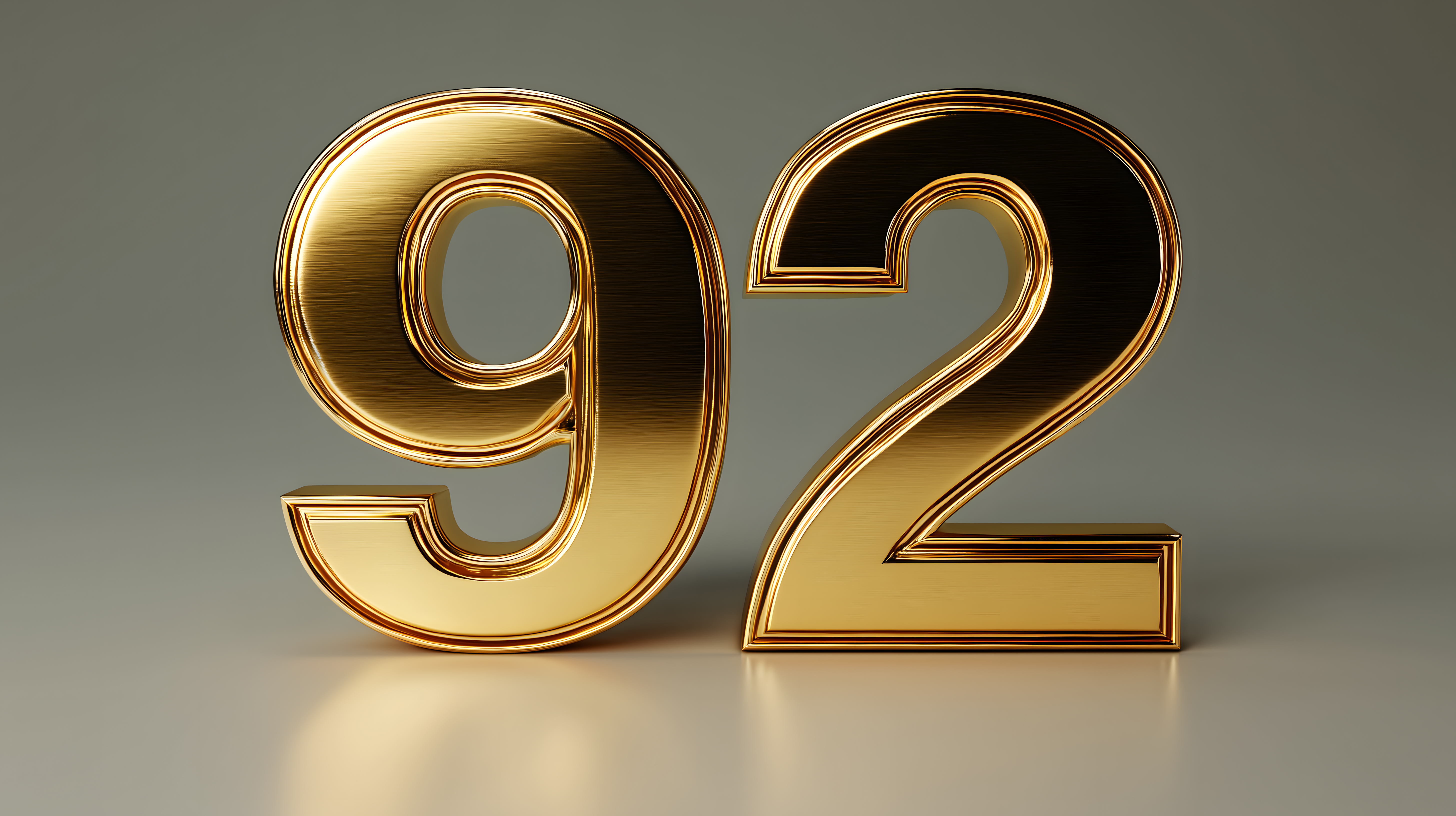 Dieses Bild zeigt zwei glänzende, goldene dreidimensionale Zahlen '92' auf einem grauen, neutralen Hintergrund. Die Zahlen sind in einem minimalistischen, eleganten Stil gestaltet und vermitteln einen Eindruck von Luxus und Hochwertigkeit. Das Foto eignet sich hervorragend als Gestaltungselement für Poster, Banner, Werbung oder andere visuelle Kommunikationsmedien, z.B. für Jubiläen, Geburtstage oder feierliche Anlässe. Als hochwertiges Stockfoto ist es unter einer Creative-Commons-Lizenz frei verwendbar.