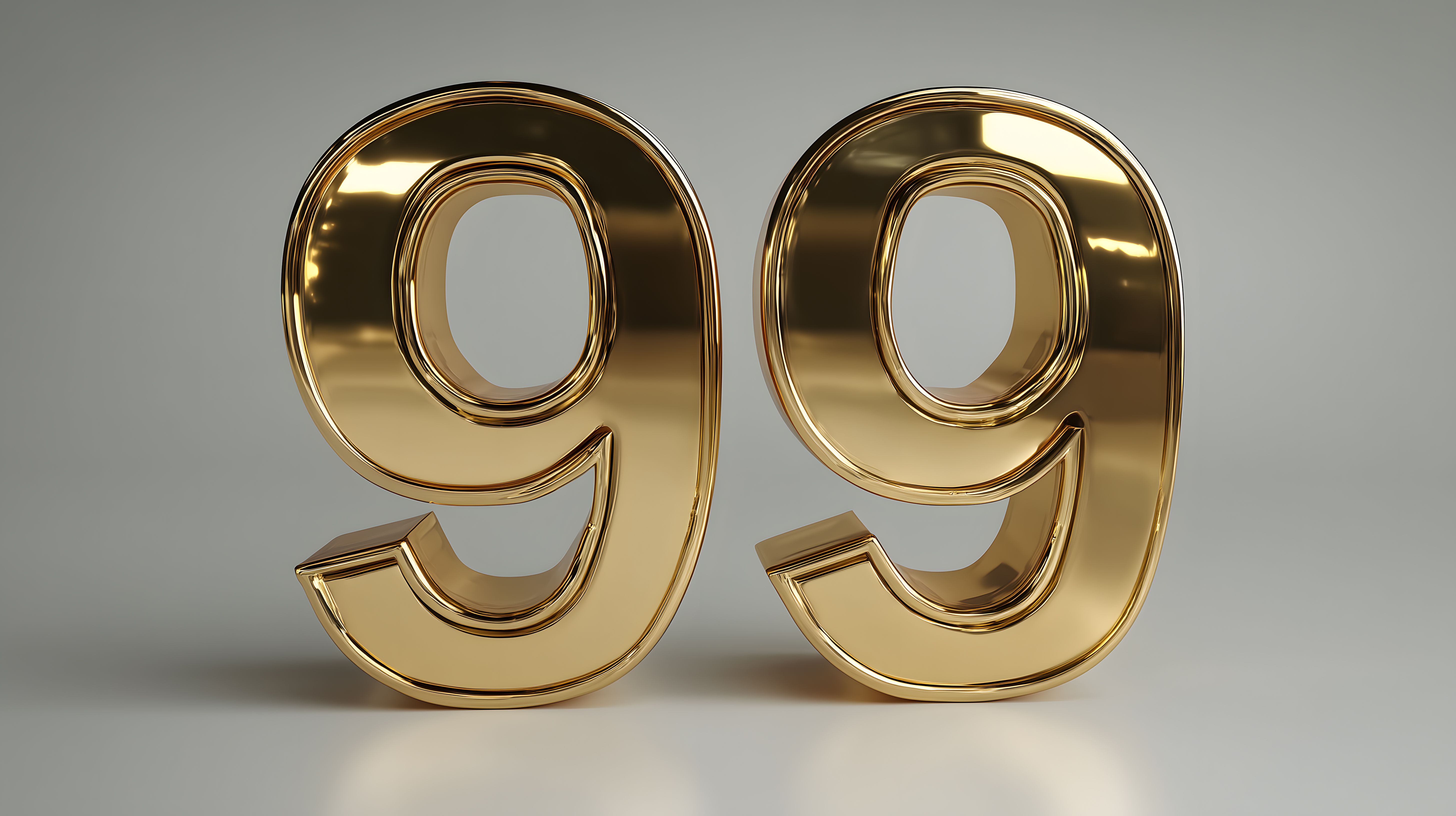 Dieses Stockfoto zeigt die glänzenden Goldzahlen '99' vor einem neutralen grauen Hintergrund. Die Zahlen haben einen eleganten, luxuriösen Metalleffekt, der sie hervorhebt und den Betrachter in den Mittelpunkt stellt. Die symmetrische Anordnung der Zahlen verleiht dem Bild eine klare, moderne Ästhetik. Dieses Foto eignet sich ideal als Hintergrundbild oder grafisches Element für Werbung, Präsentationen, Websites oder Social Media-Beiträge, die eine hochwertige, ansprechende Optik benötigen. Es ist in hoher Auflösung und kostenfrei unter der Creative Commons-Lizenz verfügbar.