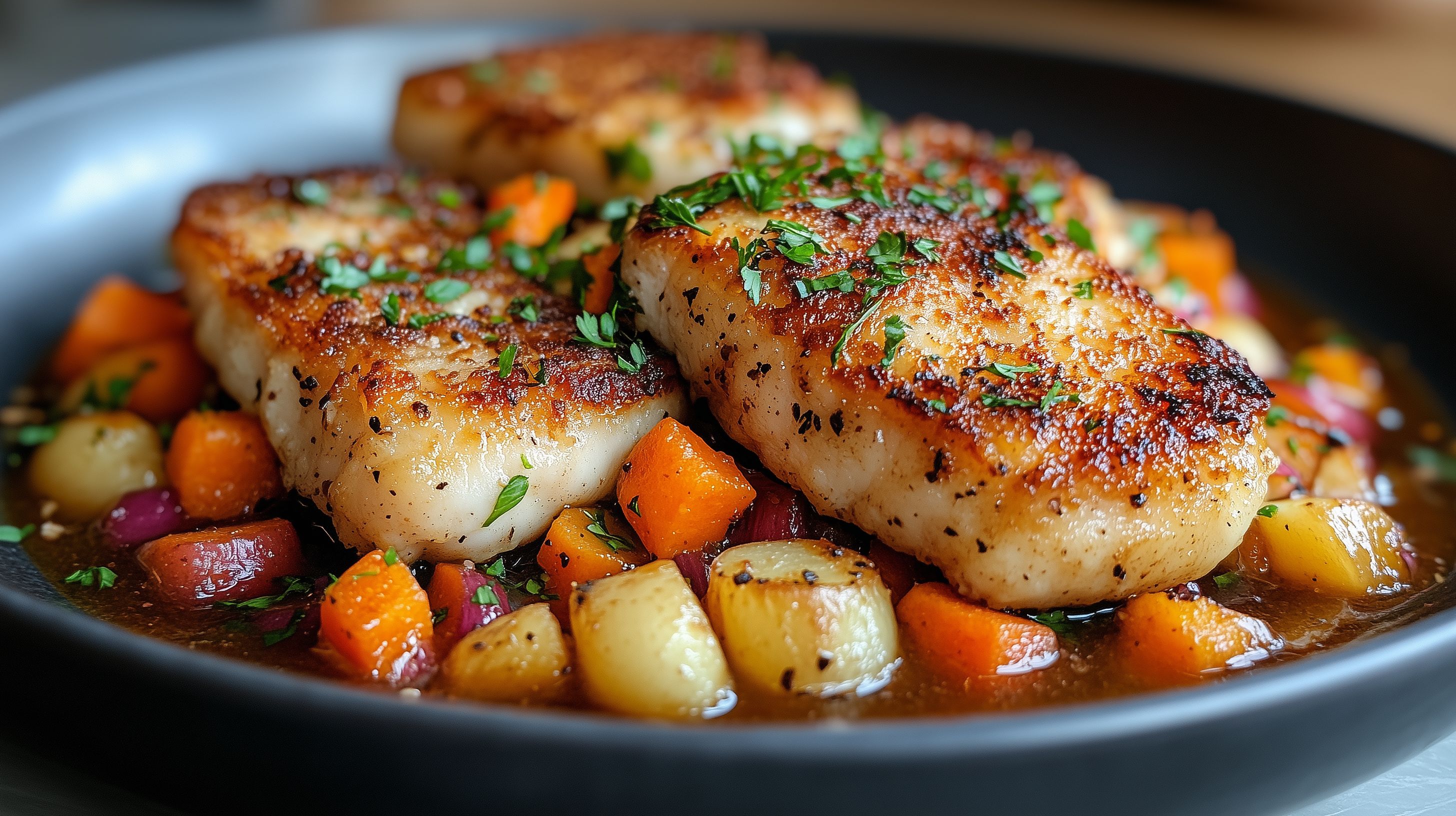 Das Foto zeigt ein schmackhaftes Gericht aus knusprig gebratenen Fischfilets, serviert auf einem Bett von sautiertem Gemüse. Die goldbraun gebratenen Fischstücke sind mit frischen Kräutern wie Petersilie garniert und verleihen dem Gericht einen appetitlichen Akzent. Dazu gibt es Kartoffelwürfel und saftige Karotten, die in einer leckeren Sauce serviert werden. Das Arrangement in der rustikalen Schüssel verleiht dem Bild eine warme, heimelige Atmosphäre, die ideal für Blogbeiträge, Social-Media-Posts oder Werbematerialien genutzt werden kann. Dieses hochauflösende und kostenlos nutzbare Stockfoto unter Creative-Commons-Lizenz bietet viele Einsatzmöglichkeiten für die Präsentation gesunder und schmackhafter Mahlzeiten.