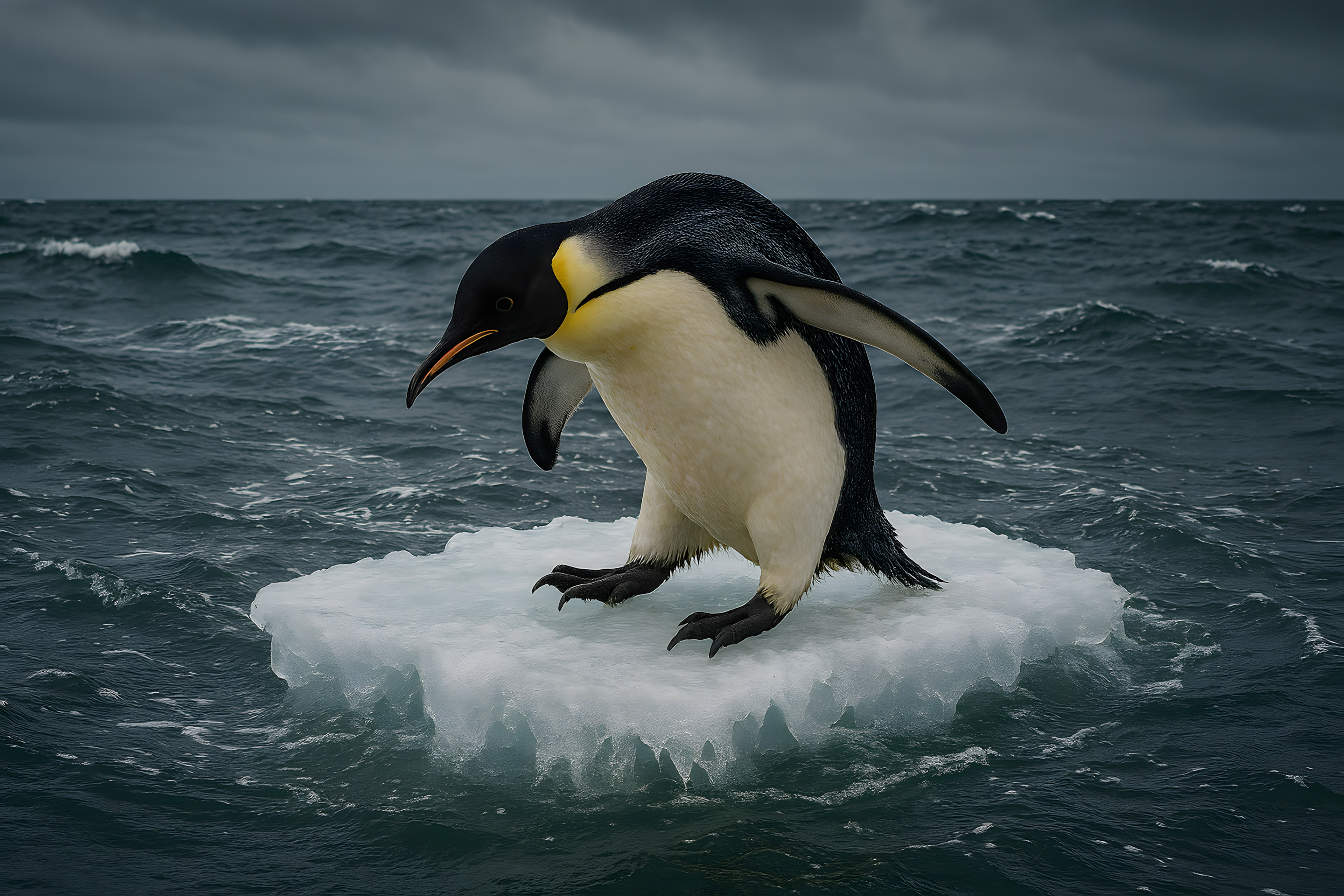 Das Foto zeigt einen einzelnen Pinguin, der auf einer kleinen, treibenden Eisscholle im sturmgepeitschten Meer steht. Der Vogel hebt sich mit seinen markanten schwarz-weißen Farben deutlich vom dunkel-gräulichen, wogenden Hintergrund ab. Der Pinguin wirkt einsam und verloren in der weiten, rauen Szenerie. Das Bild vermittelt eine starke Botschaft über die Bedrohung der Tiere durch den Klimawandel und die Zerstörung ihrer natürlichen Lebensräume. Dieses hochauflösende, kostenlose Stockfoto ist unter einer Creative-Commons-Lizenz verfügbar und eignet sich perfekt für Blogs, Newsletter, Social-Media-Posts und Werbemittel zum Thema Umweltschutz, Nachhaltigkeit und Tierwohl.