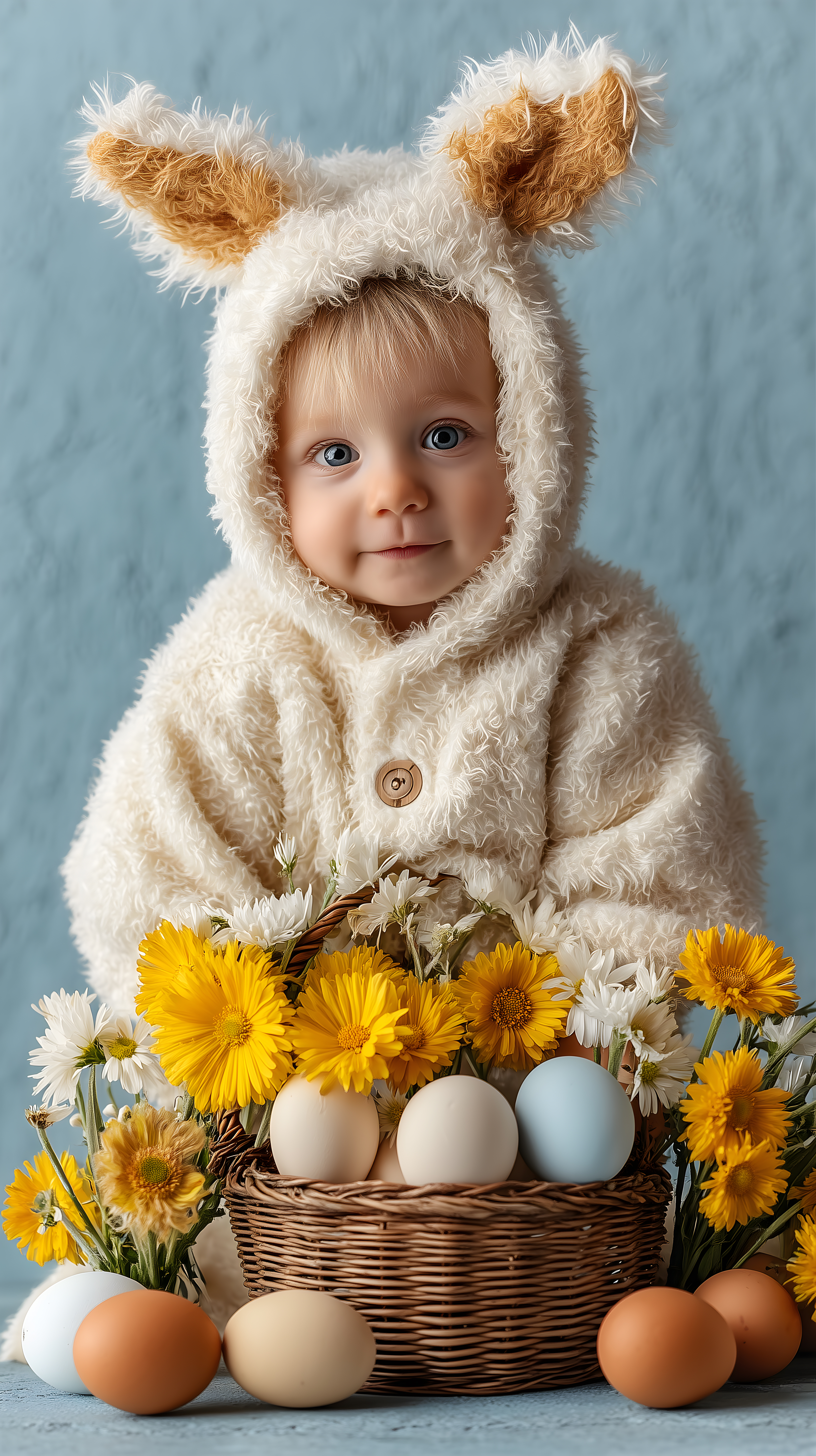 Dieses bezaubernde Foto zeigt ein Kleinkind in einem gemütlichen Osterhasenkostüm, umgeben von einem Korb voller bunter Eier und sommerlichen Blumen. Das Kind blickt mit großen, faszinierten Augen in die Kamera, seine Wangen erinnern an weiche, flauschige Kaninchen-Ohren. Die goldgelben und weißen Farbtöne des Kostüms, der Blumen und der Eier schaffen eine warme, frühlinghafte Atmosphäre. Dieses kostenlose Stockfoto in hoher Auflösung eignet sich perfekt für Oster-Dekorationen, Werbekampagnen zu Frühlingstrends, oder um einen Hauch von Natürlichkeit und Lebensfreude in Ihren Blog, Newsletter oder Social-Media-Kanäle zu bringen. Es steht unter einer Creative-Commons-Lizenz zur Verfügung.