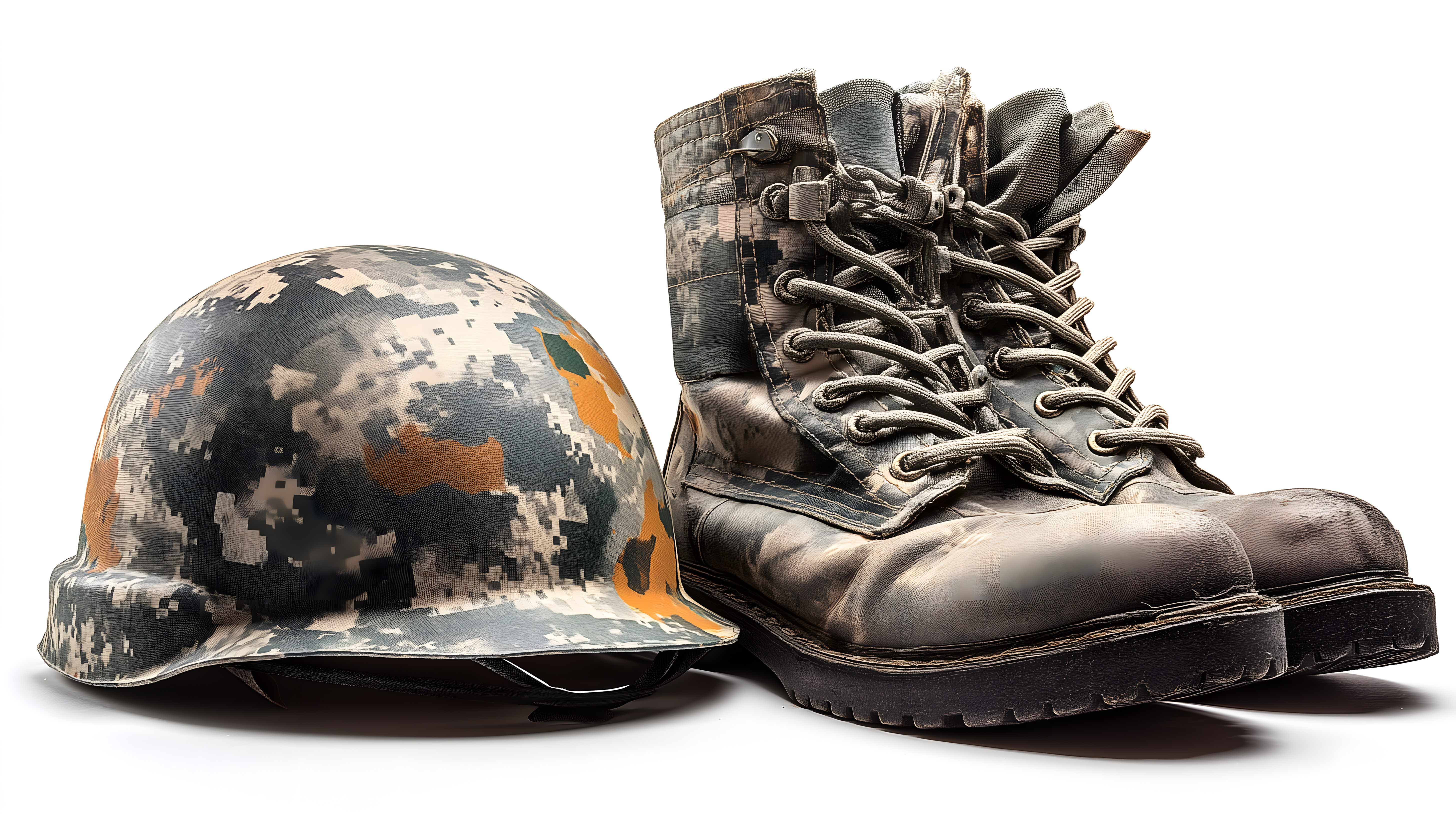 Dieses Foto zeigt moderne Militärausrüstung in einem charakteristischen Tarnmuster. Im Vordergrund sind ein Kampfhelm und ein robuster Stiefel zu sehen, die beide in einem Grün-Braun-Farbschema gehalten sind. Der Helm hat eine flache, abgerundete Form und ist mit einem Netz überzogen, während der Stiefel eine profilierte Sohle und eine hochwertige Verarbeitung aufweist. Das Foto vermittelt den Eindruck von Schutz, Sicherheit und Einsatzbereitschaft. Es eignet sich hervorragend für Verwendungen in militärischen oder sicherheitsrelevanten Kontexten, wie Magazinbeiträge, Werbekampagnen oder Webseiten zum Thema Verteidigung und Ausrüstung. Dieses hochauflösende Stockfoto ist unter einer Creative-Commons-Lizenz verfügbar und kann kostenlos für kommerzielle und private Zwecke genutzt werden.