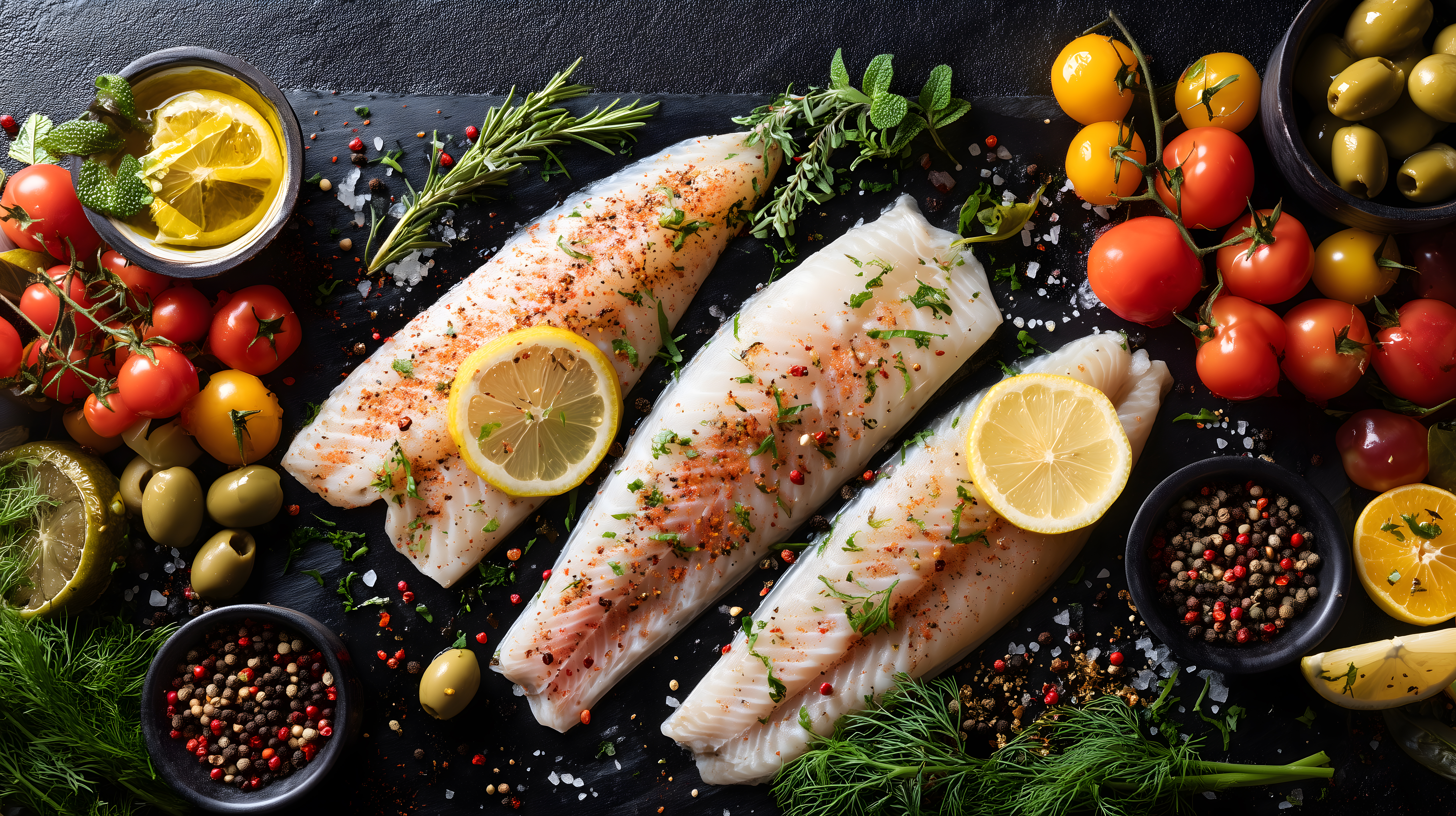 Dieses hochwertige Stockfoto zeigt ein frisches Fischfilet, das mit Kräutern und Zitrone auf einem schwarzen Hintergrund angerichtet ist. Das Bild strahlt eine natürliche, mediterrane Atmosphäre aus und eignet sich ideal für Blogs, Websites, Werbung oder Newsletter rund um Themen wie gesunde Ernährung, Kochen und Kulinarik. Das Foto ist in hoher Auflösung und unter einer Creative-Commons-Lizenz kostenlos nutzbar.