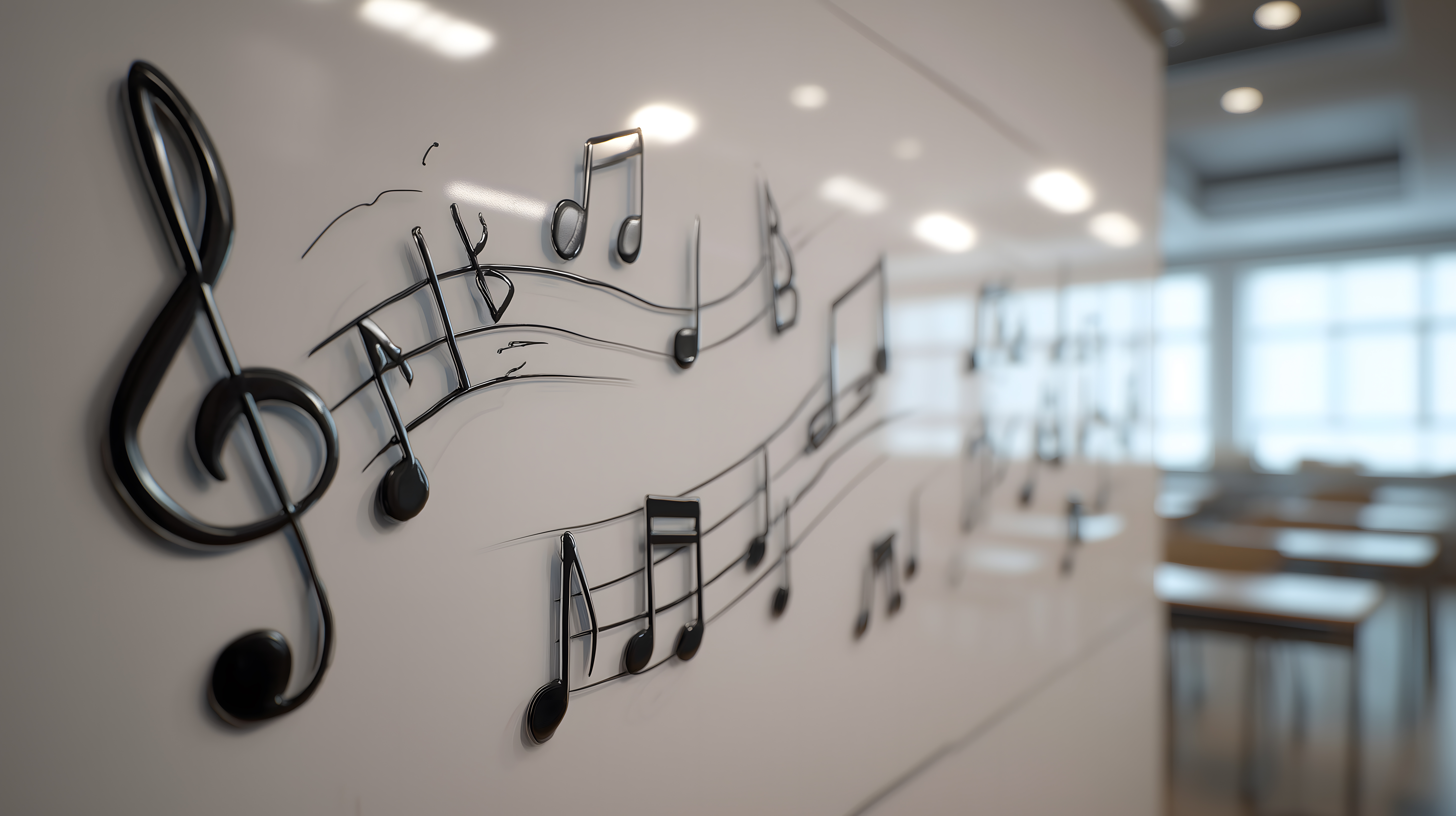 Dieses Bild zeigt eine Wandillustration mit verschiedenen Musiknoten und -symbolen wie Notenschlüssel, Pausenzeichen und Taktstriche. Die Grafiken sind in Schwarz auf einer weißen Wand angebracht, was einen modernen, minimalistischen Eindruck vermittelt. Der Hintergrund lässt auf einen Klassenraum schließen, der durch große Fenster hell erleuchtet wird. Diese Illustration wäre ideal für Blogs, Newsletter oder Social-Media-Beiträge rund um das Thema Musik, Kreativität und Bildung.
