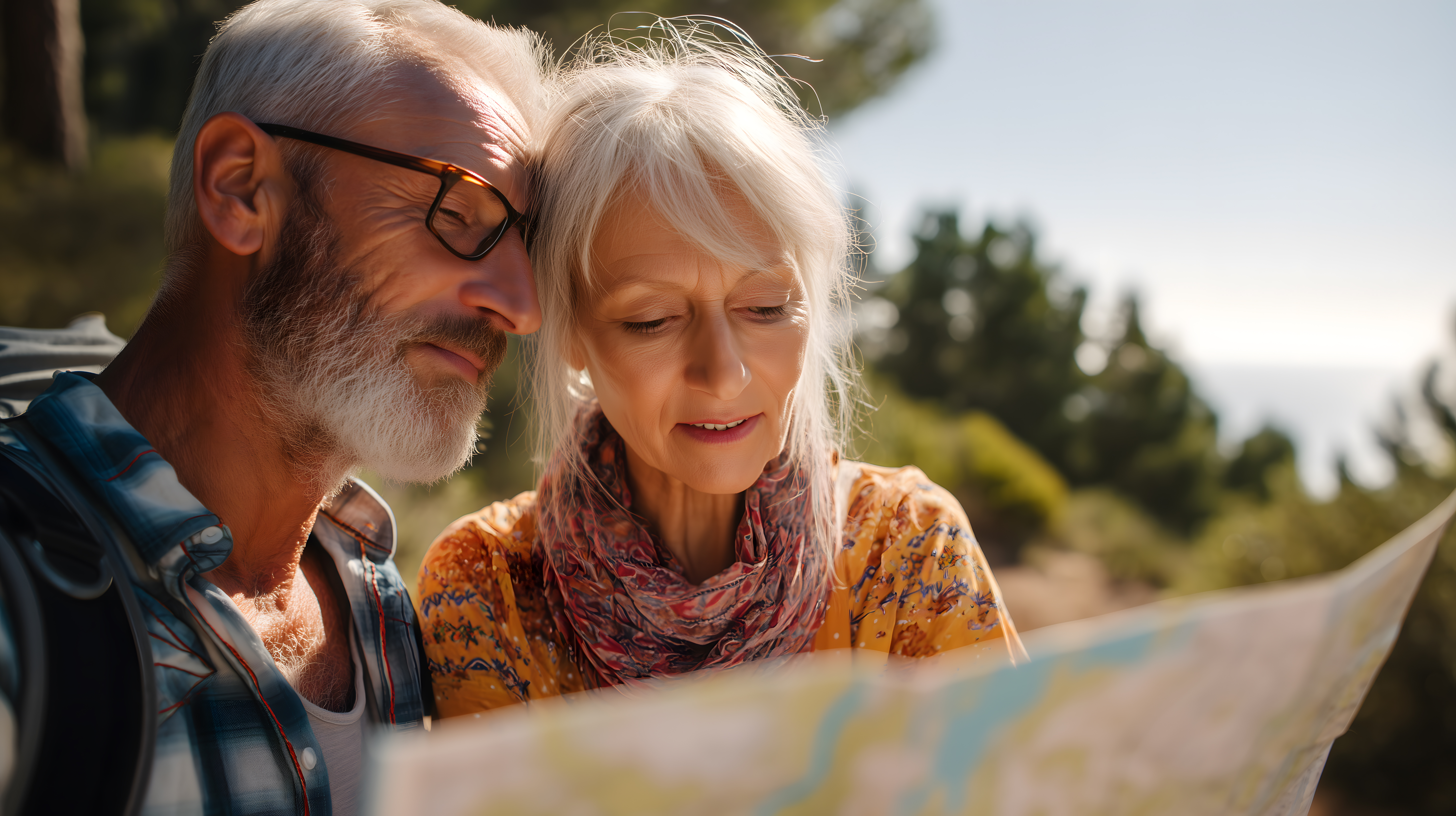 Das Bild zeigt ein älteres Paar, das gemeinsam eine Wanderkarte betrachtet, umgeben von einer idyllischen Naturlandschaft. Die Frau trägt einen bunten Schal, während der Mann eine Brille und einen Bart hat. Beide scheinen vertieft in die Karte und diskutieren wohl ihre nächsten Schritte für den Wanderausflug. Die Szenerie vermittelt ein Gefühl von Entdeckungsdrang, Aktivität und Lebensfreude im Ruhestand. Dieses kostenlose Stockfoto in hoher Auflösung unter einer Creative-Commons-Lizenz eignet sich hervorragend für Blogbeiträge, Newsletter oder Social-Media-Posts rund um das Thema Outdoor-Aktivitäten, Reisen und aktives Altern.