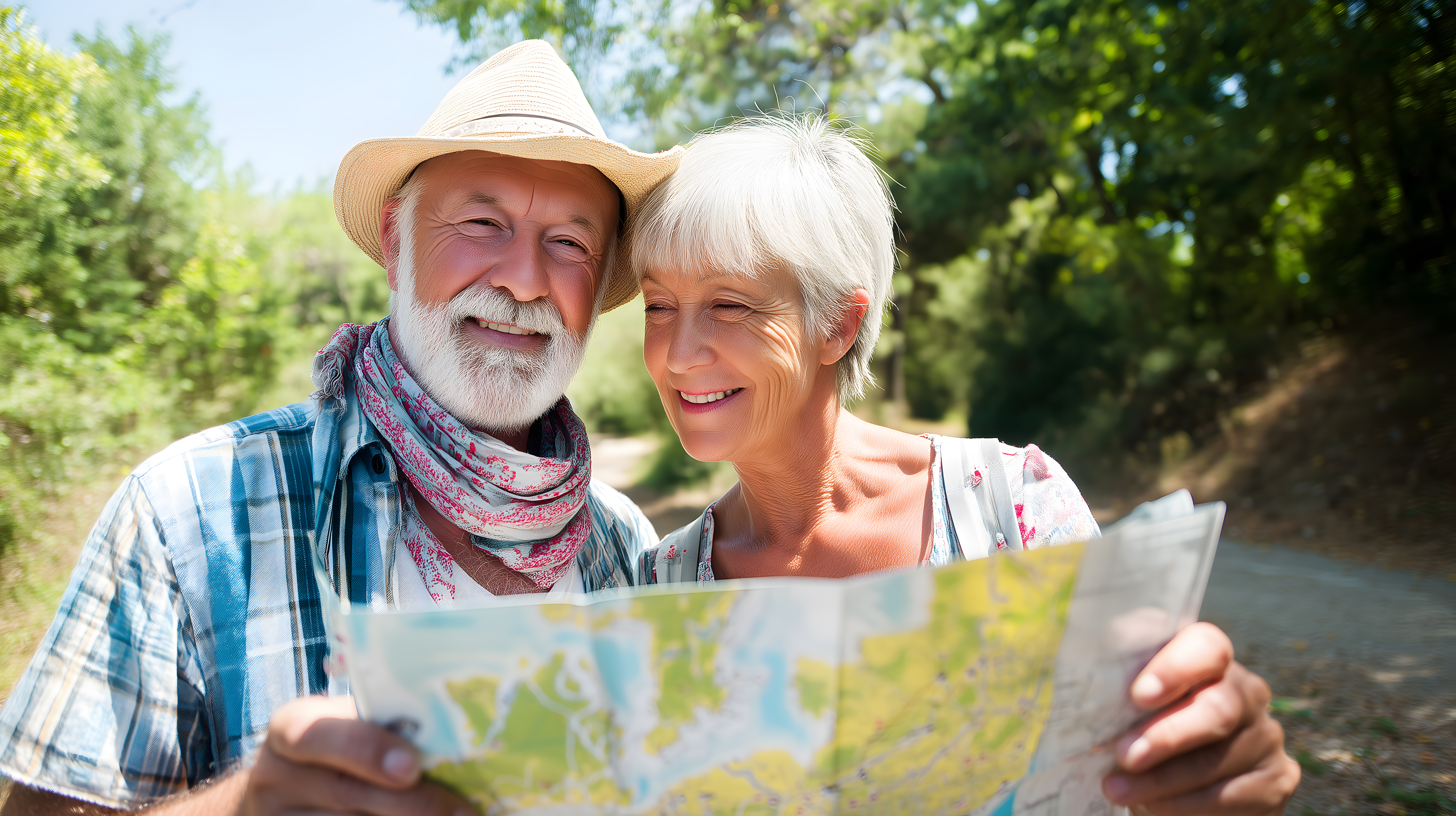 Dieses Foto zeigt ein älteres Paar, das gemeinsam in der Natur wandert und eine Landkarte betrachtet. Sie tragen Wanderkleidung und lächeln zufrieden. Ihre offenen Gesichtsausdrücke und entspannten Körperhaltungen vermitteln ein Gefühl von Freude und Zufriedenheit beim Entdecken der Umgebung. Das Bild eignet sich hervorragend für Themen wie Reisen, Tourismus, gesunden Lebensstil und aktives Alter. Es ist ein kostenloses Stockfoto in hoher Auflösung unter Creative-Commons-Lizenz, das vielfältig in Blogs, Newslettern, Social Media und Werbung eingesetzt werden kann.