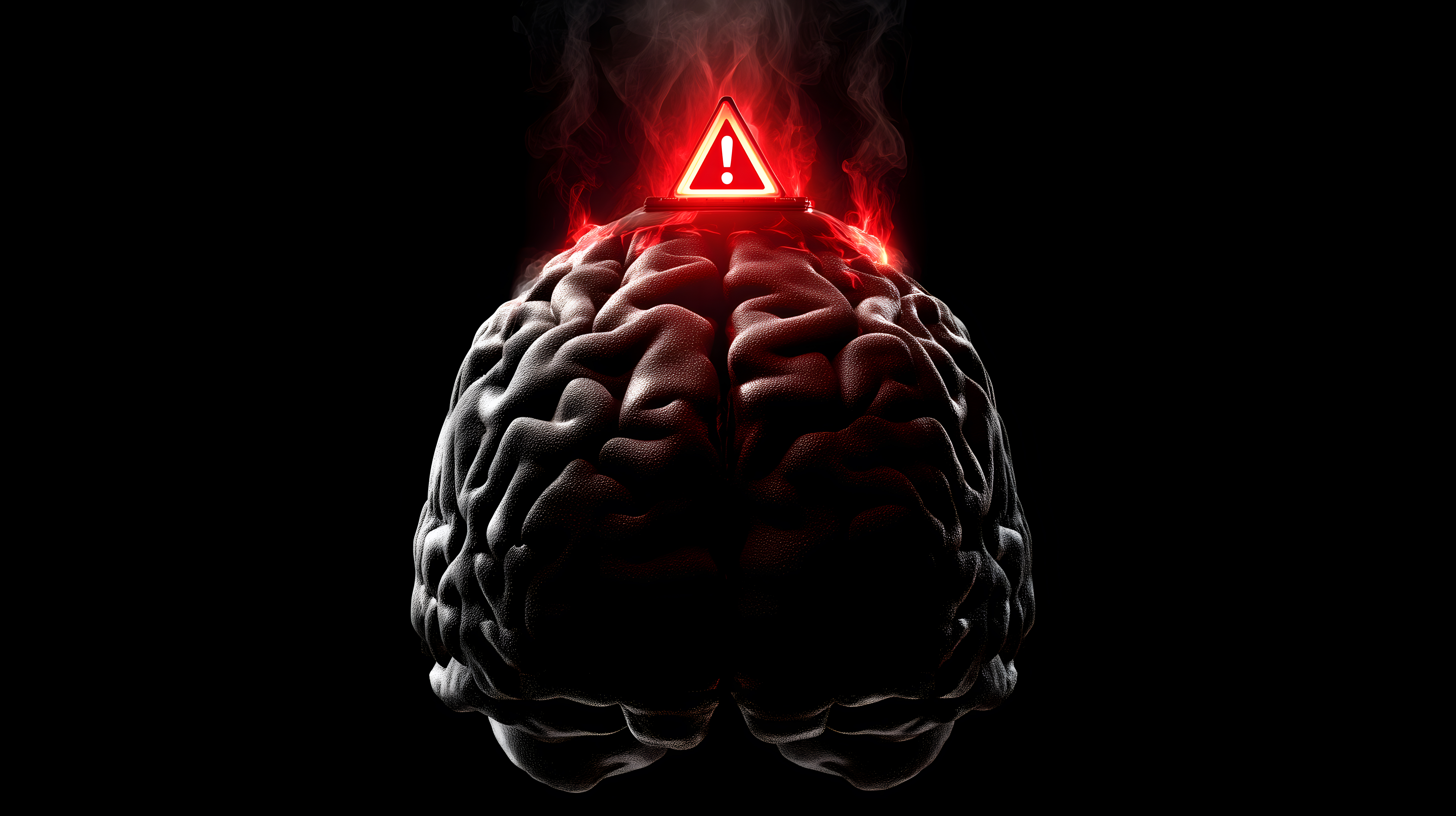Diese beeindruckende digitale Darstellung zeigt das menschliche Gehirn mit einem leuchtenden Warndreieck darauf. Das Bild vermittelt ein starkes Bild für die Themen Stress und Burnout. Die dunkle, kontrastreiche Farbgebung und die realistische 3D-Optik verleihen dem Motiv eine intensive, warnende Ausstrahlung.