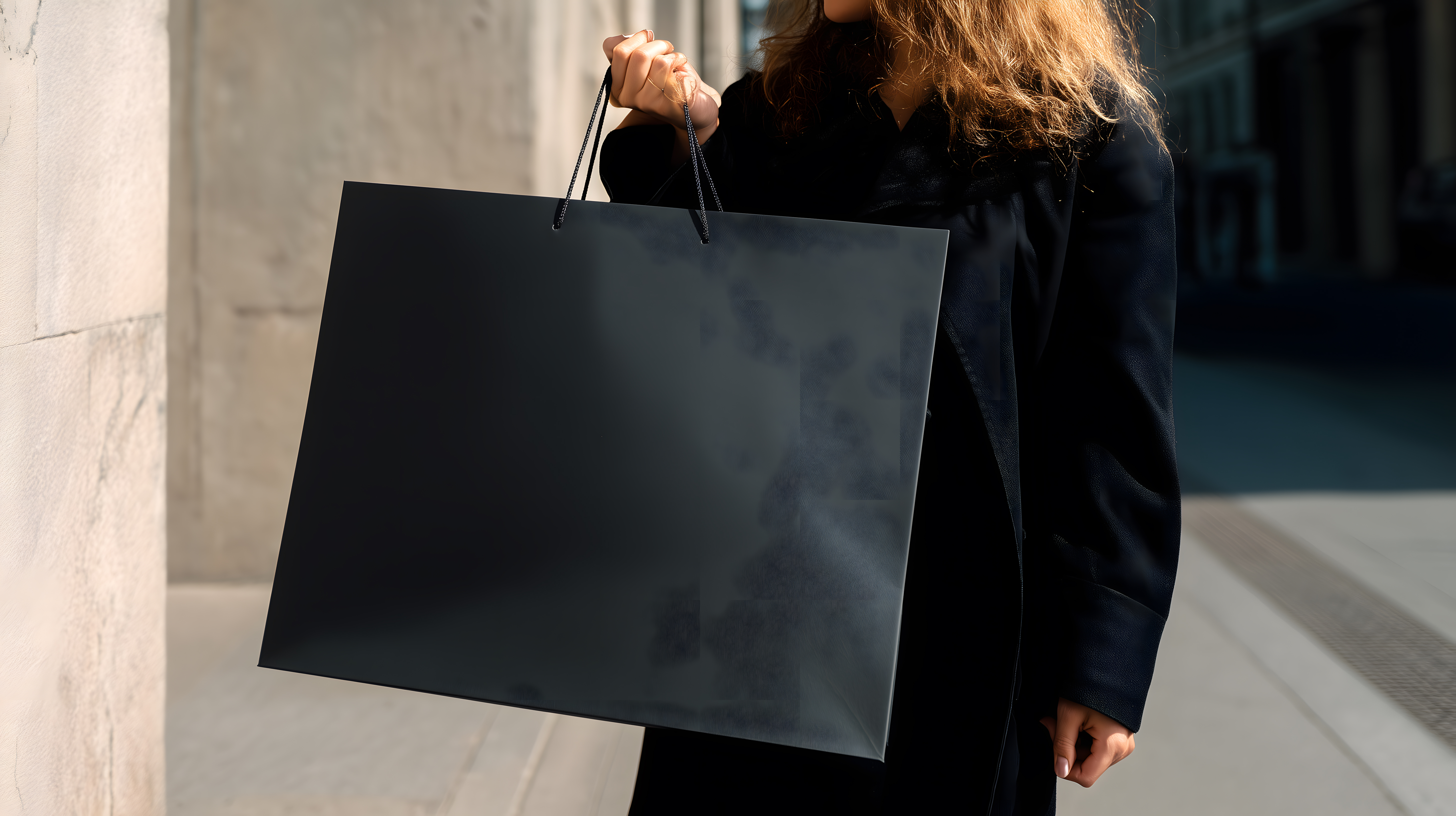 Das Bild zeigt eine Frau, die eine große, schwarze Einkaufstasche in der Hand hält und auf einer Stadtstraße steht. Im Hintergrund sind Gebäude und eine Fassade zu sehen, die den urbanen Kontext verdeutlichen. Das Foto vermittelt einen Eindruck von Mode, Lebensstil und Konsum in einer modernen Stadtumgebung. Das hochauflösende Bild eignet sich hervorragend für die Verwendung in Blogs, Newslettern, Social-Media-Beiträgen oder Werbematerialien, da es unter einer Creative-Commons-Lizenz veröffentlicht wurde und kostenfrei genutzt werden kann.