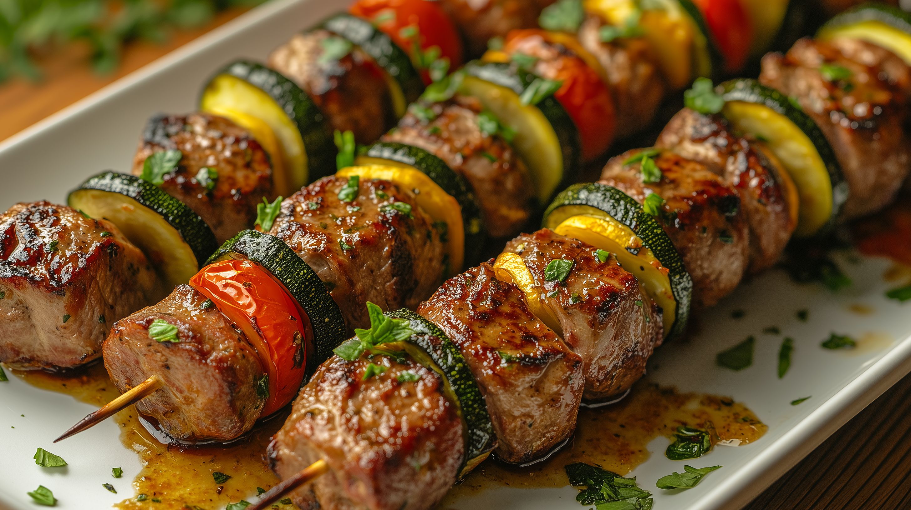 Dieses appetitliche Foto zeigt eine Platte mit frisch zubereiteten mediterranen Lammspießen, angerichtet mit gegrilltem Gemüse wie Zucchini und Tomaten. Die Spieße sind in einer schmackhaften Marinade gegart und wirken durch die leicht verkohlten Oberflächen besonders lecker. Das Gericht präsentiert sich auf einem Holztisch dekorativ und einladend. Dieses Bild eignet sich hervorragend für Rezeptbeiträge, Sommerfest-Ankündigungen oder Catering-Werbung auf Blogs, in Newslettern oder sozialen Medien. Als hochwertiges Stockfoto unter Creative-Commons-Lizenz ist es frei nutzbar.