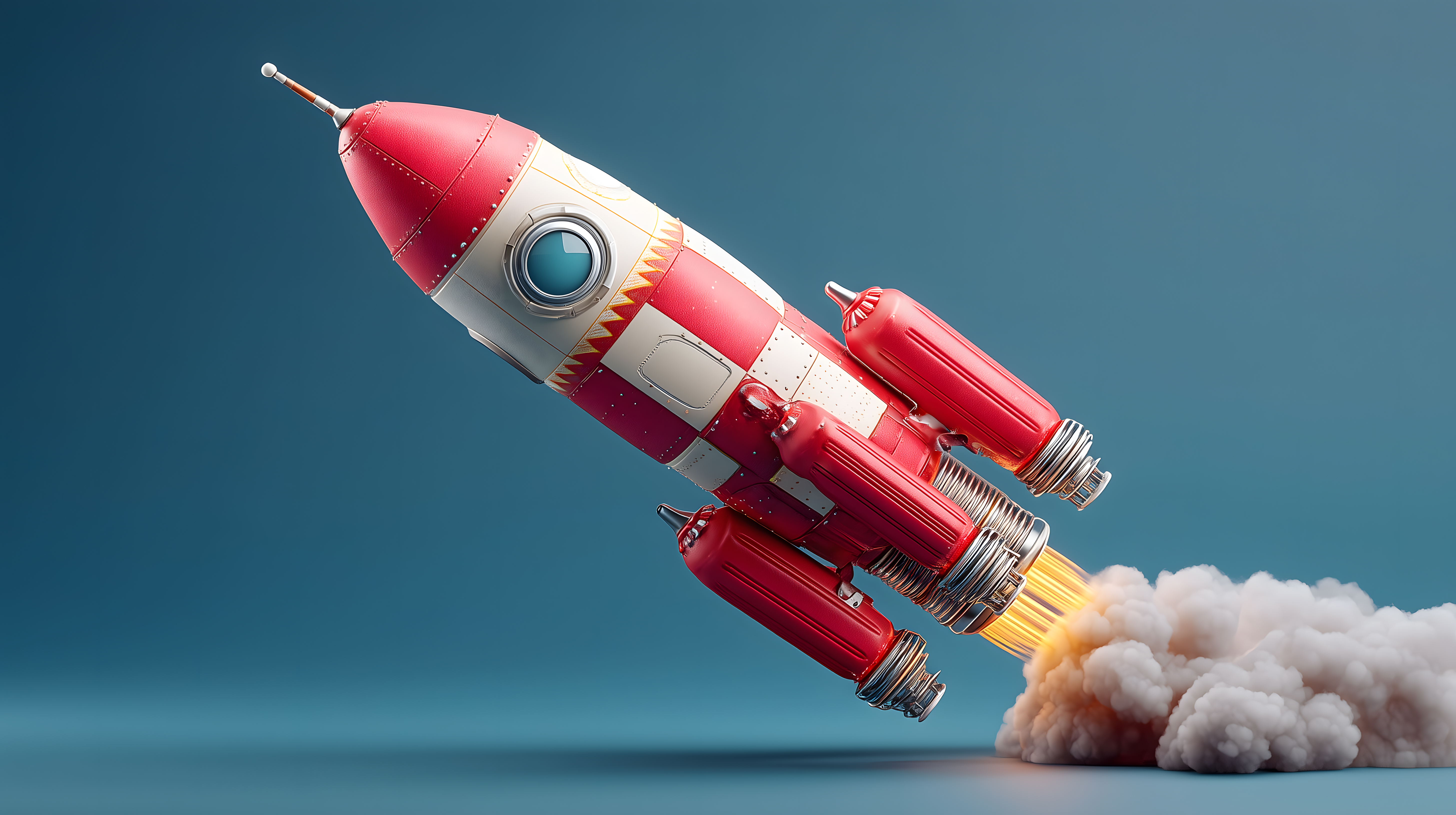 Dieses Bild zeigt eine futuristische, rot-weiße Retro-Rakete, die vor einem tiefblauen Himmel mit weißen Wolken abhebt. Die detailreiche Illustration lässt die Rakete beinahe lebendig erscheinen, mit ihren leuchtend roten Triebwerken, die einen Schwall weißen Rauch ausstoßen. Die Komposition lenkt den Blick des Betrachters direkt auf das Zentrum der Aktion, die Rakete selbst, und vermittelt so ein Gefühl von Dynamik und Fortschritt. Dieses Stockfoto eignet sich hervorragend für Blogbeiträge, Newsletter oder Social-Media-Posts zu Themen wie Raumfahrt, Technologie, Zukunft oder Kreativität. Es ist in hoher Auflösung verfügbar und unter einer Creative-Commons-Lizenz kostenlos nutzbar.
