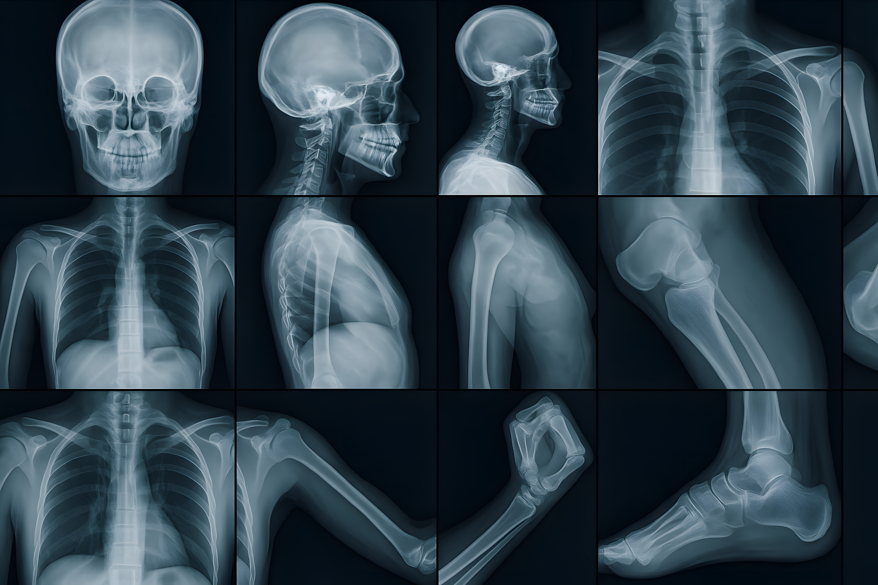 Diese detaillierten Röntgenaufnahmen zeigen verschiedene Perspektiven des menschlichen Körpers. Die monochrome Schwarz-Weiß-Darstellung gibt einen umfassenden Überblick über das Skelett, die Wirbelsäule, den Schädel, den Thorax und die Extremitäten. Die Aufnahmen eignen sich hervorragend für den Einsatz in medizinischen Lehrmaterialien, Artikeln zur Gesundheit und Anatomie sowie für visuelle Präsentationen in Wissenschaft und Forschung. Als kostenloses Stockfoto in hoher Auflösung unter Creative-Commons-Lizenz können die Bilder vielfältig genutzt werden - beispielsweise in Blogs, Newslettern oder sozialen Medien.
