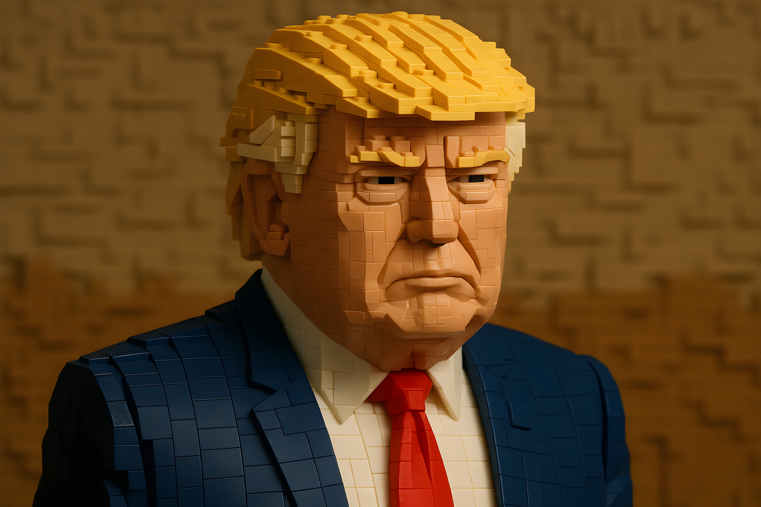 Dieses Foto zeigt eine detaillierte Nahaufnahme einer Statue von Donald Trump, dem ehemaligen Präsidenten der Vereinigten Staaten, die aus Lego-Steinen gefertigt wurde. Die Statue zeigt eine realistische Darstellung von Trumps Gesichtszügen, inklusive seiner charakteristischen Frisur und Gesichtsausdruck. Die Statue ist in einem dunklen Anzug mit roter Krawatte gekleidet, was ein typisches Outfit des Politikers darstellt.