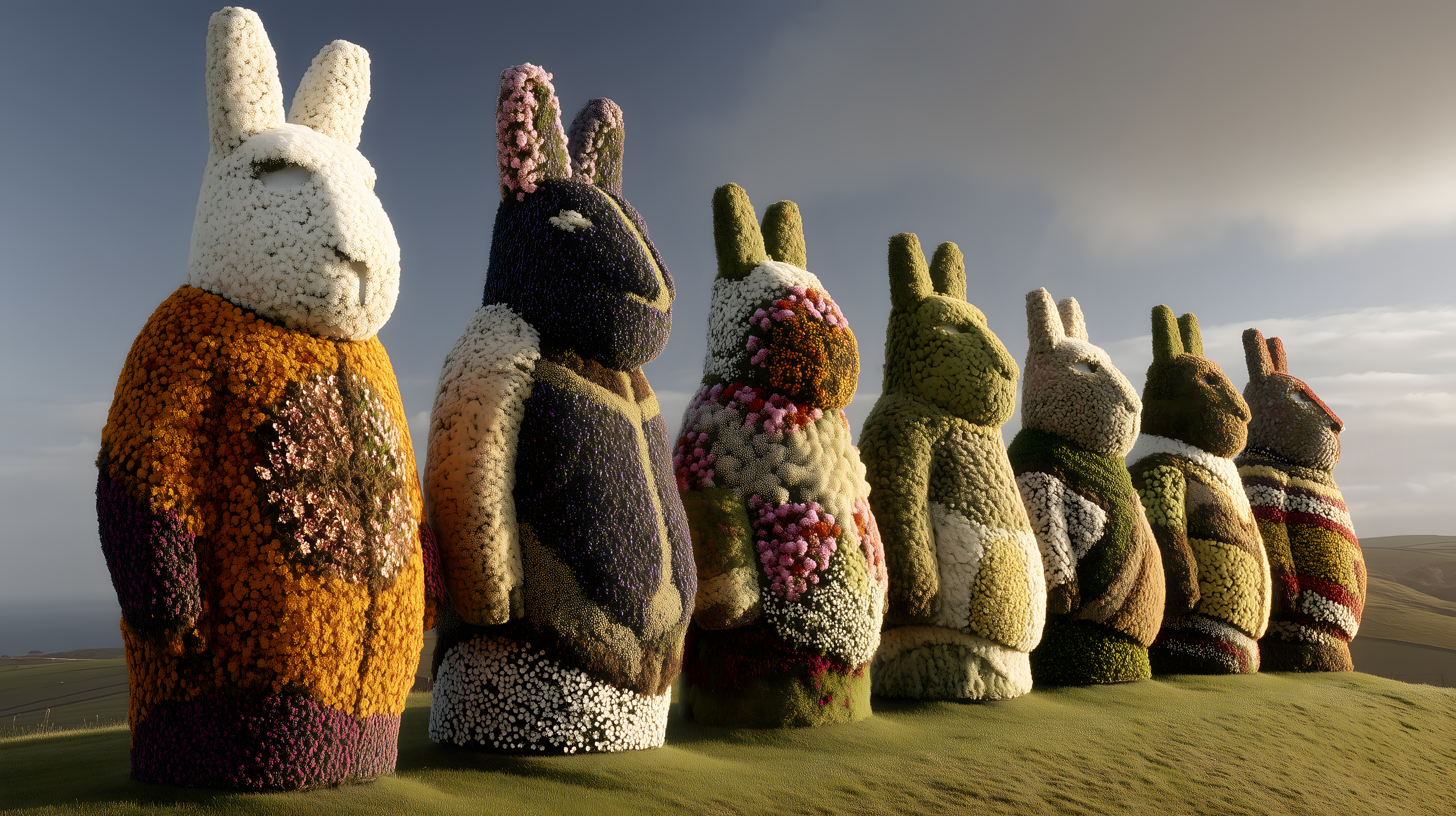 Das Bild zeigt eine eindrucksvolle Gruppe riesiger Osterhasen-Skulpturen, die aus natürlichen Materialien wie Blumen und Pflanzen gestaltet wurden. Die Hasen sind in einer Reihe aufgestellt und blicken über eine grüne Wiese hinweg in die Ferne. Jedes Exemplar ist individuell mit verschiedenen Mustern, Farben und Formen verziert, was dem Gesamtbild eine fantasievolle, kunstvolle Atmosphäre verleiht. Die Perspektive des Fotos lässt die Hasen noch größer und beeindruckender erscheinen. Dieses einzigartige, kostenloses Stockfoto eignet sich hervorragend für die Verwendung in Blogbeiträgen, Newslettern oder Social-Media-Inhalten zum Thema Frühling, Ostern oder kreative Gartenkunst. Die hochauflösende Datei steht unter der Creative-Commons-Lizenz zur freien Verwendung zur Verfügung.