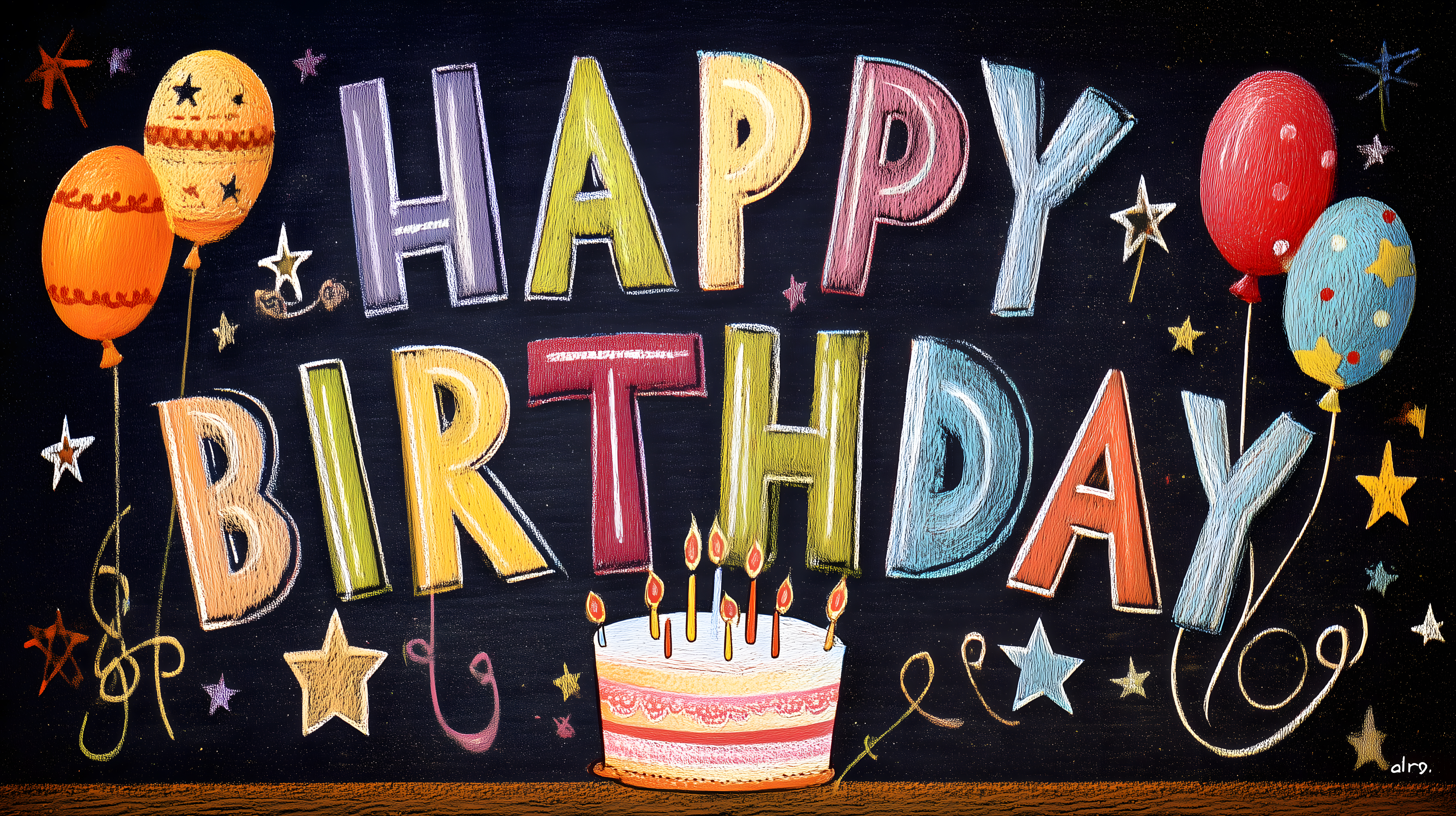 Dieses farbenfrohe und handgemalt wirkende Bild zeigt eine detailliert gestaltete Geburtstagskarte. Der Schriftzug 'Happy Birthday' ist in verschiedenen Farben und Stilen gehalten, umgeben von Elementen wie Luftballons, Sternen und einem Geburtstagskuchen. Die Komposition ist symmetrisch und die Farbpalette besteht aus warmen Tönen wie Orange, Rot und Gelb sowie kühlen Farben wie Blau und Lila. Dieses Stockfoto eignet sich hervorragend für den Einsatz in Blogbeiträgen, Newslettern, sozialen Medien und Werbeaktionen rund um Geburtstage und Feiern. Die hochauflösende Datei steht unter einer Creative-Commons-Lizenz zur kostenlosen Verwendung zur Verfügung.