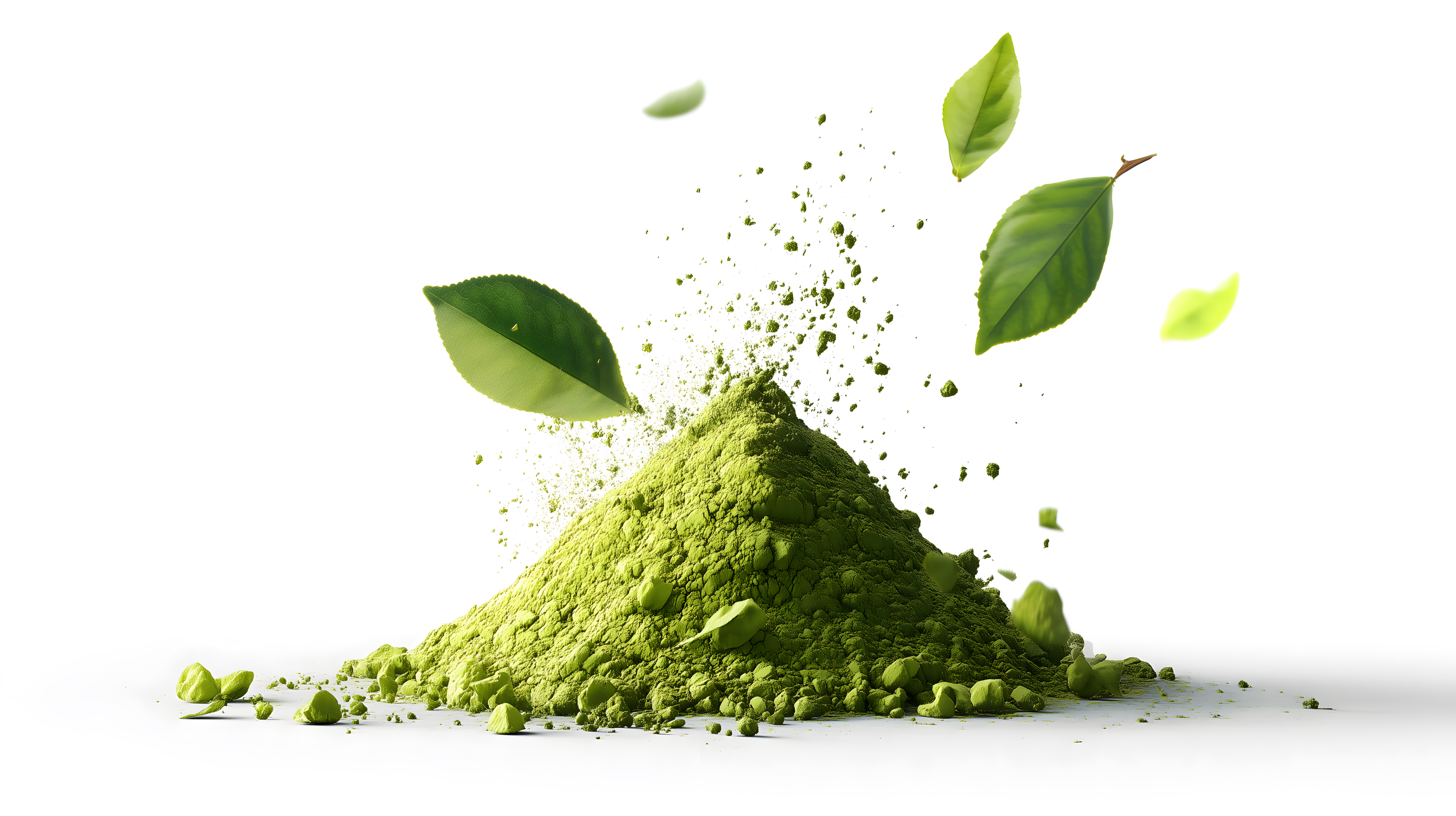 Dieses Foto zeigt eine Nahaufnahme von frisch gemahlenem Matcha-Pulver, umgeben von grünen Teeblättern auf weißem Hintergrund. Das sattgrüne Pulver dominiert die Szene und verleiht dem Bild eine natürliche, frische Ausstrahlung. Die feinen Partikel des Pulvers sind deutlich sichtbar, was auf die hochwertige Qualität des Produkts hinweist.