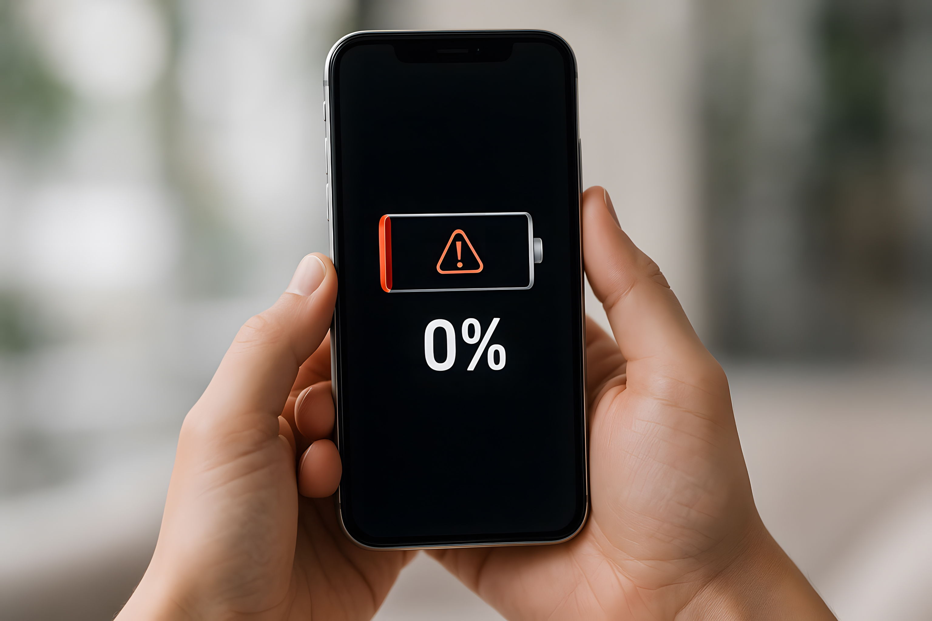 Das Foto zeigt ein Smartphone-Display, das einen niedrigen Akkustand von 0% und eine Warnanzeige anzeigt. Der Fokus liegt auf dem Smartphone, das von Händen gehalten wird, was die Relevanz des Themas unterstreicht. Die dunkle Hintergrundunschärfe lenkt den Blick auf das Wesentliche - das Smartphone selbst.