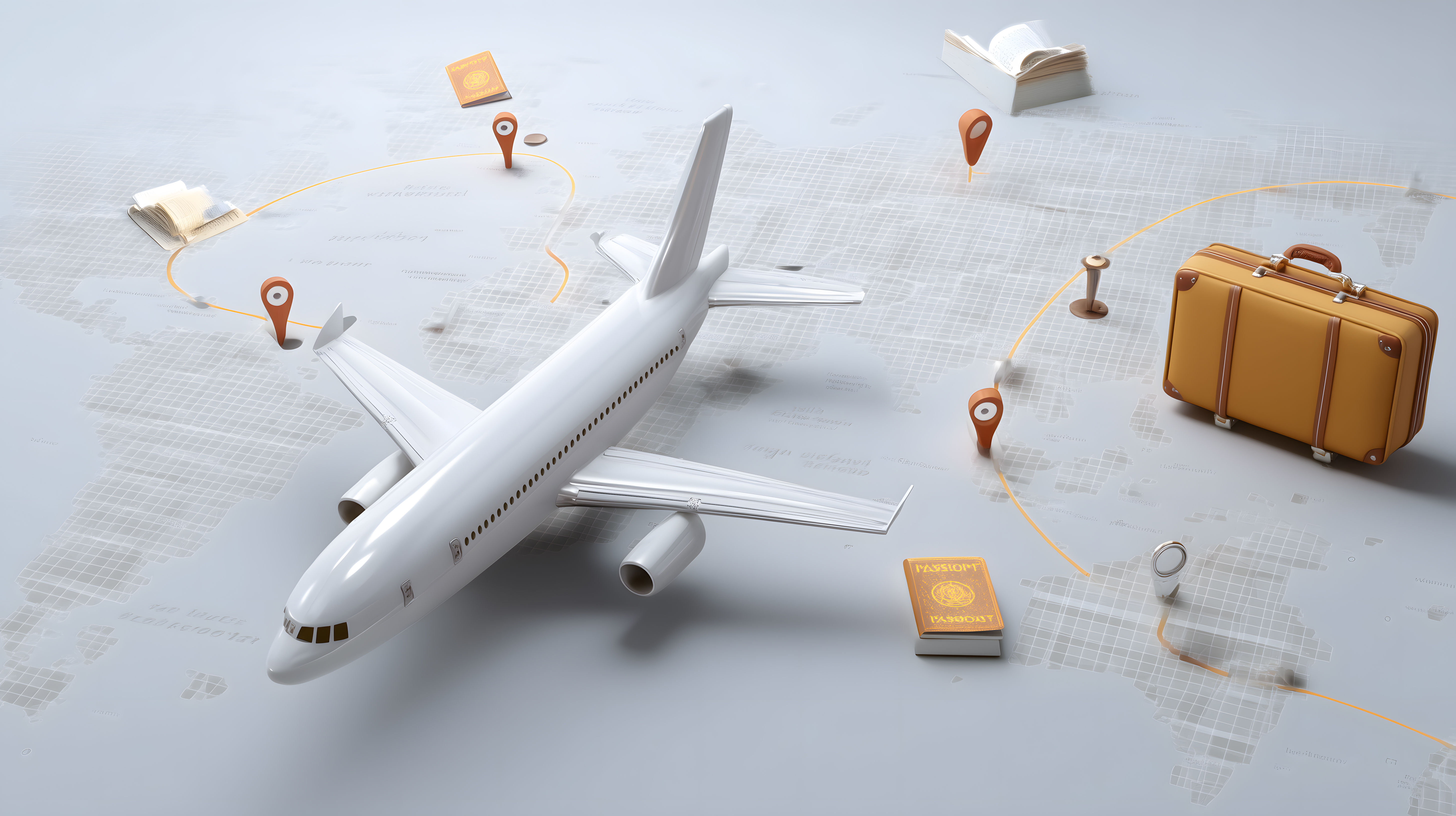 Das Bild zeigt ein 3D-Rendering eines Flugzeugs über einer abstrakten, grauen Weltkarte. Rund um das Flugzeug sind verschiedene Reiseaccessoires wie Koffer, Pässe und Standortmarkierungen zu sehen. Die klaren Linien und das reduzierte Farbschema verleihen dem Bild eine moderne, minimalistische Ästhetik, die perfekt für den Einsatz in Blogs, Newslettern, Social Media-Beiträgen oder Werbematerialien zum Thema Reisen, Tourismus und Mobilität geeignet ist. Dieses hochauflösende Stockfoto ist unter einer Creative Commons-Lizenz frei verfügbar.