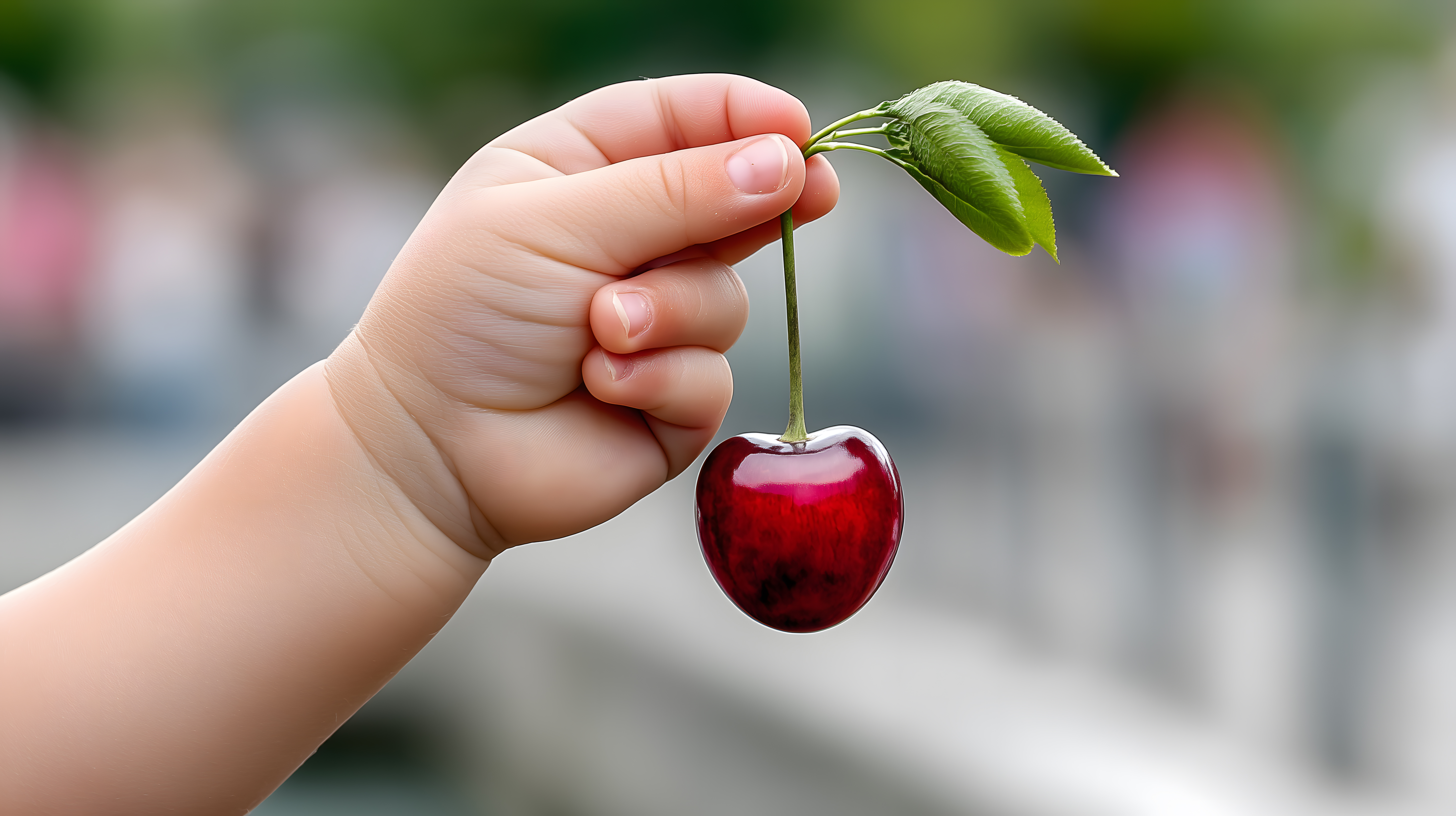 Das Bild zeigt eine Kinderhand, die eine saftige, rote Kirsche mit grünem Blatt hält. Der Fokus liegt auf der frischen Frucht, eingebettet in eine leicht verschwommene, grüne Umgebung. Diese natürliche Aufnahme strahlt Frische, Gesundheit und Lebendigkeit aus. Sie eignet sich perfekt als Hintergrundbild oder Illustrationselement für Blogs, Newsletter, Social-Media-Posts oder Werbematerialien rund um Ernährung, Nachhaltigkeit und einen gesunden Lebensstil. Das hochauflösende Stockfoto ist unter der Creative-Commons-Lizenz kostenlos für private und kommerzielle Zwecke nutzbar.