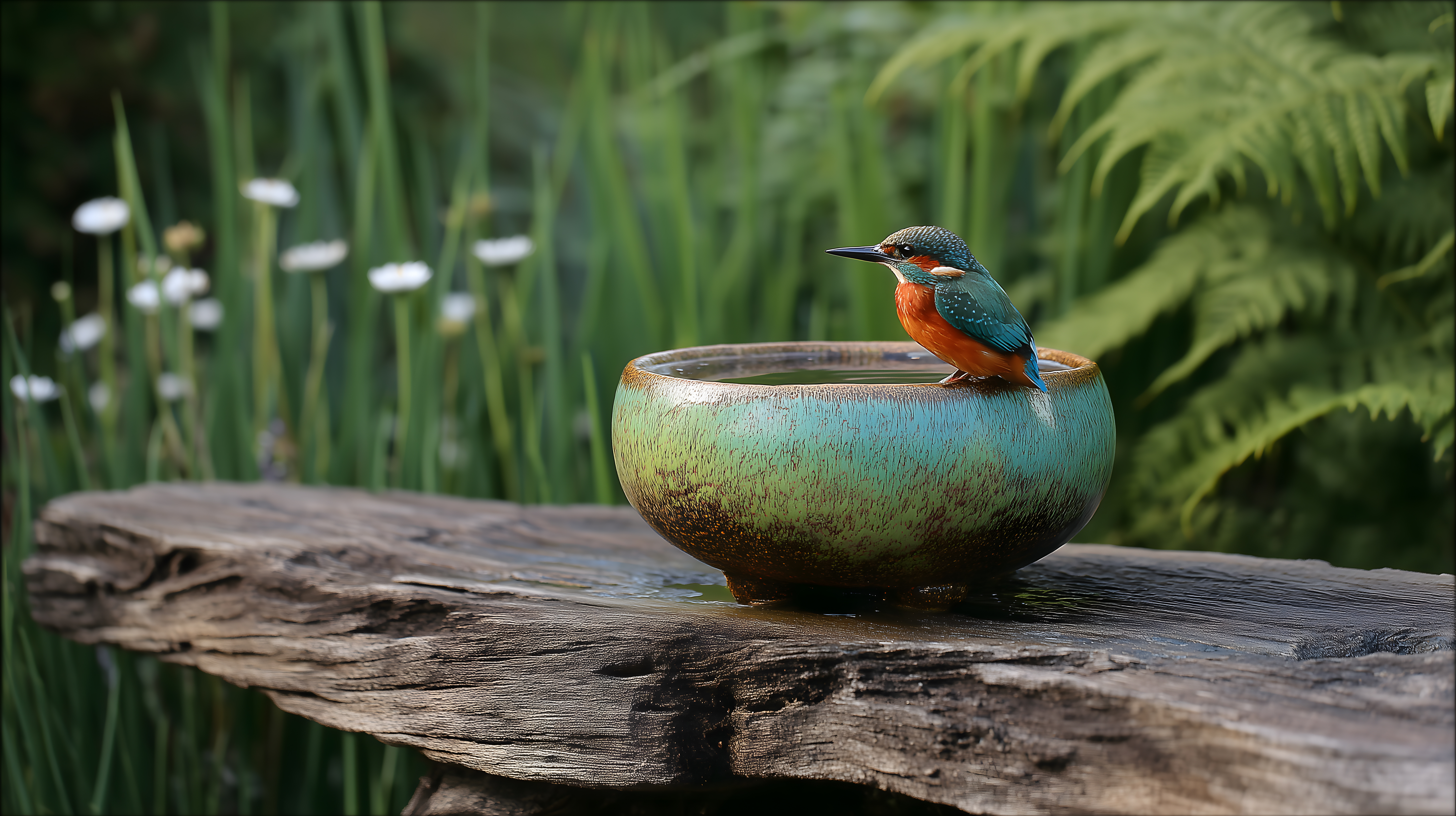 Das Bild zeigt einen prächtigen Eisvogel, der auf einer hölzernen, mit Moos bewachsenen Vogeltränke in einem üppigen, grünen Garten sitzt. Der Fokus liegt auf dem farbenprächtigen Gefieder des Eisvogels, das in einem satten Blau, Orange und Grün erstrahlt. Der naturbelassene Hintergrund mit Schilfgras und Farnen schafft eine ruhige, friedliche Atmosphäre. Dieses einzigartige Naturbild wäre ein perfekter Blickfang für Blogs, Social-Media-Beiträge oder Werbekampagnen rund um Naturthemen, Gartenpflege oder Vogelfotografie. Als hochwertiges, kostenloses Stockfoto in hoher Auflösung unter Creative-Commons-Lizenz eignet es sich hervorragend für vielfältige Projekte.