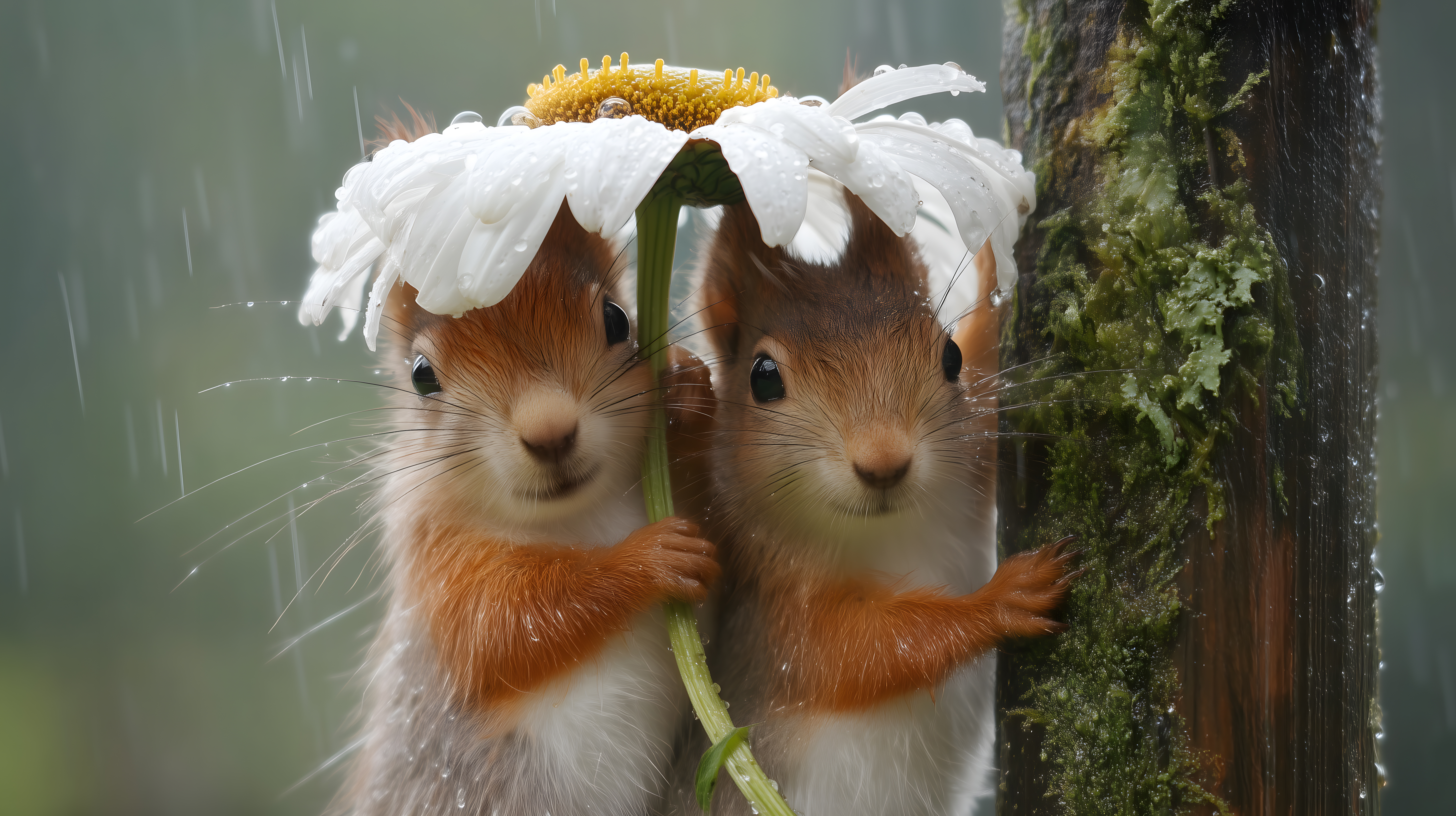 Das Foto zeigt zwei süße Eichhörnchen, die sich unter einer großen weißen Blume vor dem Regen verstecken. Sie haben ihre Köpfe nur gerade so über dem Blütenstiel hervorgestreckt und blicken mit ihren großen Augen neugierig aus ihrem Unterschlupf. Der Regen fällt dicht über ihnen herunter, während das Moos am Baumstamm und das Grün der Umgebung eine frische, natürliche Atmosphäre schaffen. Diese einzigartige Szene aus der Tierwelt wäre ein hervorragendes kostenloses Stockfoto in hoher Auflösung, das sich für den Einsatz in Blogs, Newslettern oder sozialen Medien eignen würde. Die Aufnahme steht unter einer Creative Commons-Lizenz zur Verfügung.