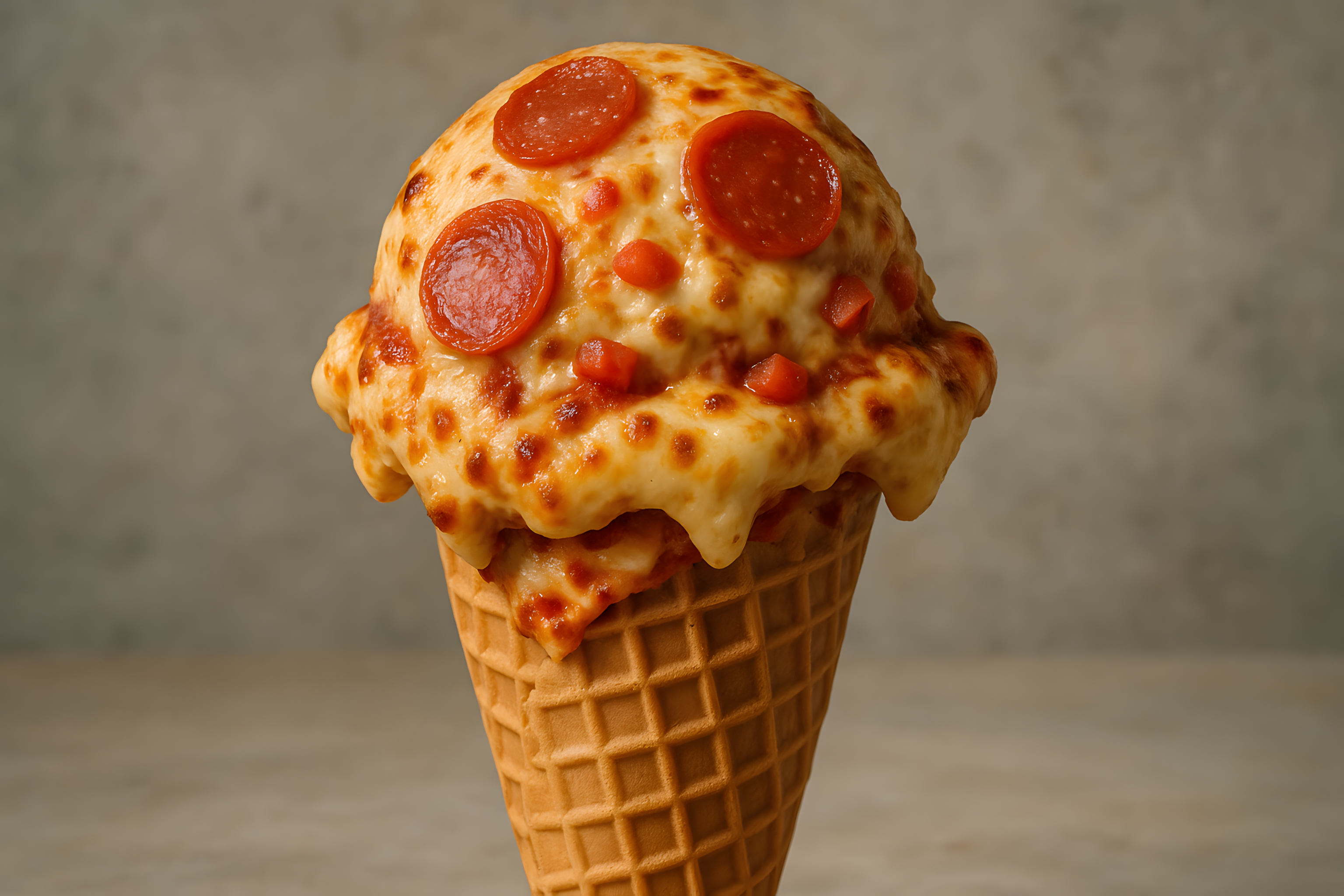 Dieses appetitliche Foto zeigt eine leckere Pizza-Kugel, die in einem Waffelkegel serviert wird. Die knusprige Oberfläche ist mit Scheiben von saftiger Salami und geschmolzenem Käse belegt, was den Betrachter unweigerlich in Versuchung führt. Das Foto besticht durch seine satte Farbgebung, die perfekte Anordnung der Zutaten und die ungewöhnliche Präsentation in einem Eiswaffel-Kegel. Dieses Stockfoto eignet sich hervorragend für Werbe- und Marketingzwecke im Lebensmittelbereich, etwa für Food-Blogs, Restaurantwebsites oder Social-Media-Posts. Mit seiner hohen Auflösung und Creative-Commons-Lizenz ist es frei nutzbar.