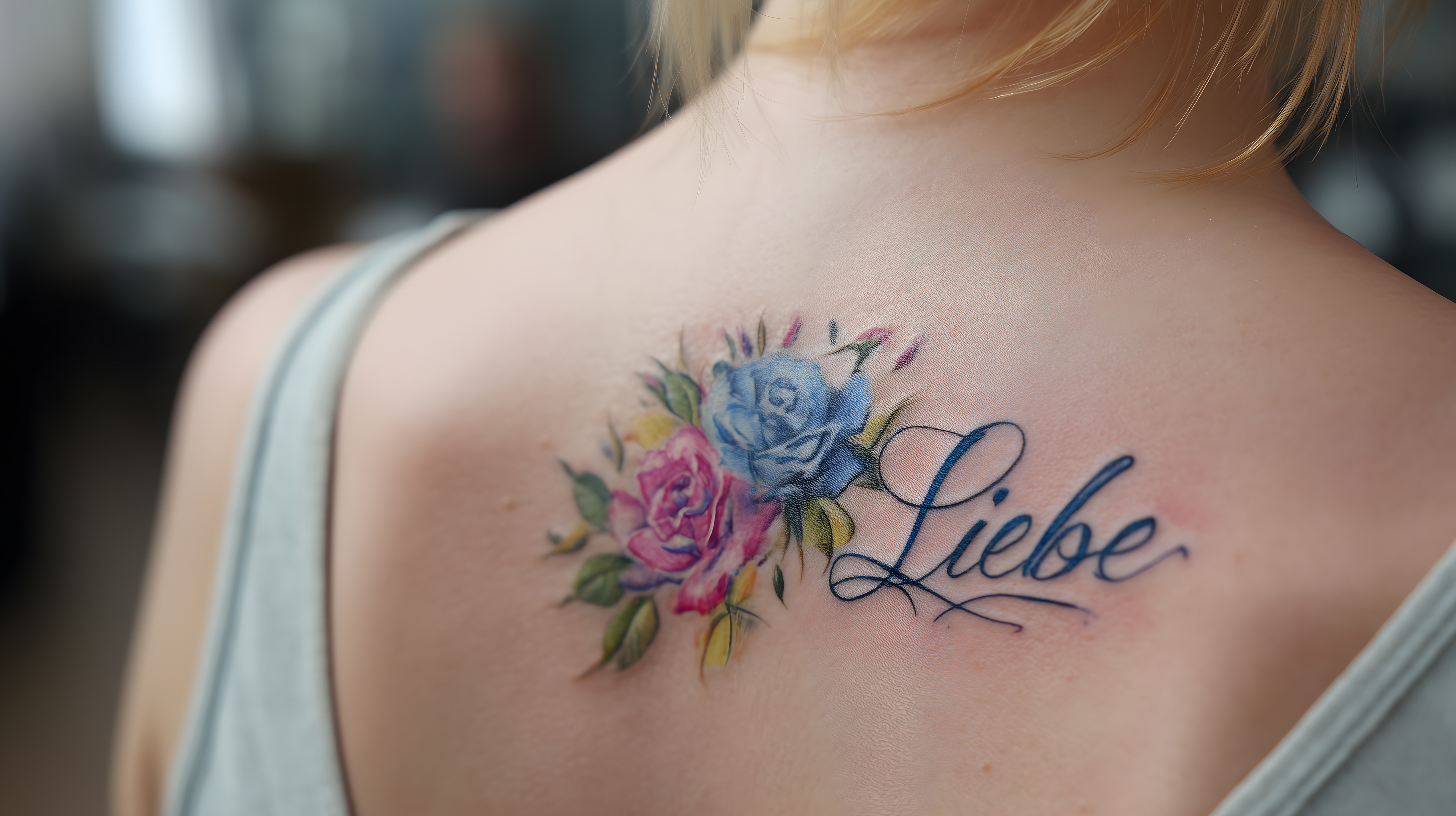 Das Foto zeigt einen Rücken mit einem farbenfrohen Tattoo-Motiv. Zu sehen sind zwei Rosen in Rosa und Blau, die sich um einen Schriftzug mit dem Wort 'Liebe' schlingen. Das Tattoo ist detailliert und dreidimensional gestaltet, wodurch es sehr ästhetisch und ausdrucksstark wirkt. Der Fokus liegt auf der Körperkunst, die dem Foto eine feminine und romantische Ausstrahlung verleiht. Dieses hochwertige Stockfoto in hoher Auflösung eignet sich perfekt für den Einsatz in Blogs, Newslettern, Social-Media-Posts oder Werbematerialien, die einen kreativen, individuellen und ästhetischen Charakter haben sollen. Es ist unter einer Creative-Commons-Lizenz frei verwendbar.