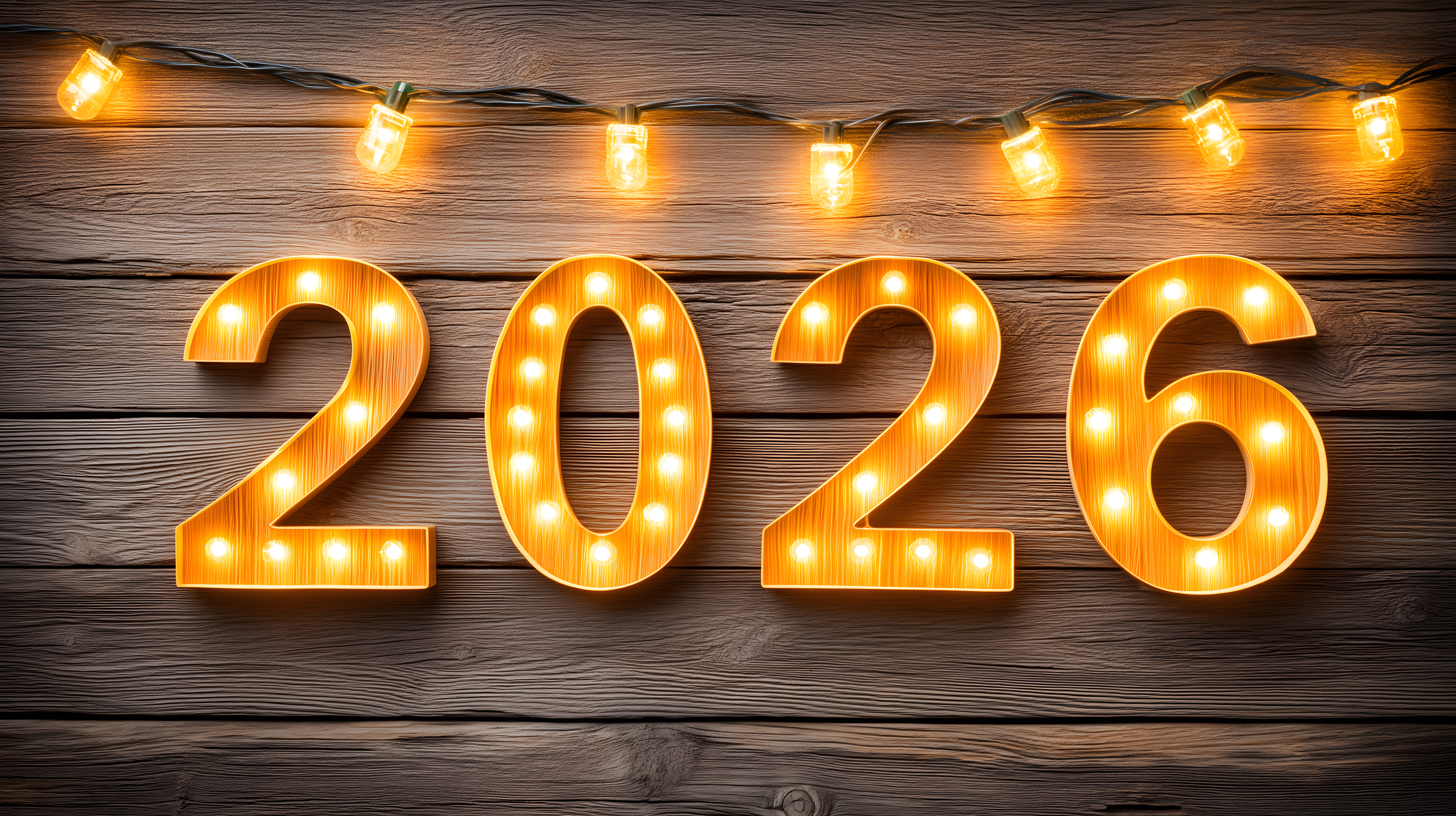 Dieses Bild zeigt eine strahlende Zahlenkomposition für das Jahr 2026, die vor einem rustikalen Holzhintergrund angeordnet ist. Die einzelnen Zahlen sind aus Holz gefertigt und mit einer warmen, orangefarbenen Beleuchtung ausgestattet, die eine festliche und einladende Stimmung schafft. Die Lichterkette, die über dem Ganzen angebracht ist, verleiht dem Motiv zusätzlichen Glanz und Atmosphäre.