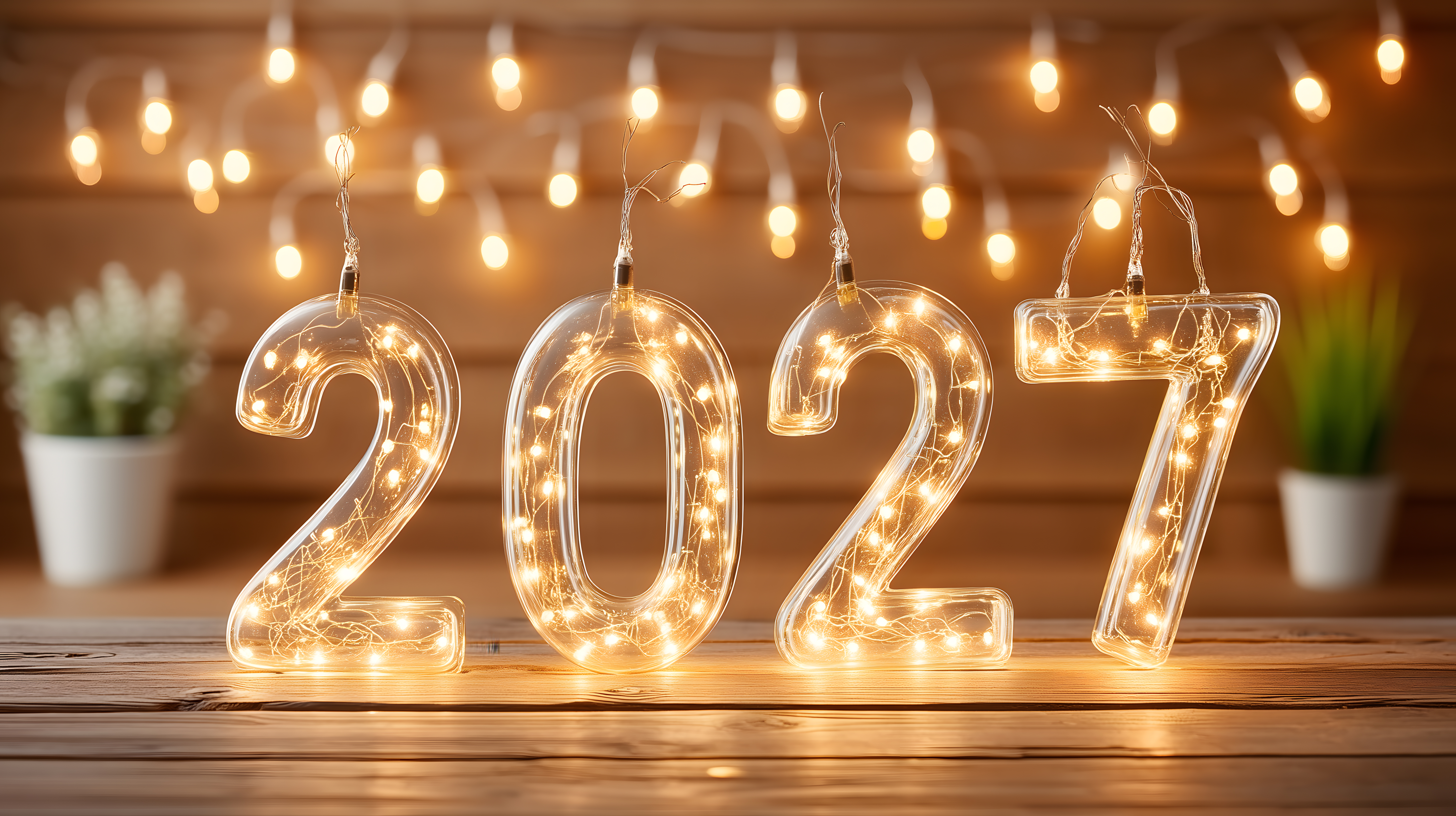 Dieses festliche Bild zeigt eine Silvesterdekoration, die perfekt für die Jahreswende 2027 geeignet ist. Auf einem hölzernen Untergrund befinden sich große, gläserne Leuchtzahlen, die durch eine Lichterkette beleuchtet werden. Der warme Glanz der Lichter erzeugt eine stimmungsvolle, gemütliche Atmosphäre und lässt das Bild besonders einladend erscheinen. Diese einzigartige Aufnahme ist ein hochwertiges, kostenloses Stockfoto in hoher Auflösung, das sich ideal für Verwendungen in Blogs, Newslettern, sozialen Medien oder Werbematerialien eignet. Die kreative Komposition und die hochwertige Umsetzung machen dieses Bild zu einem echten Hingucker.
