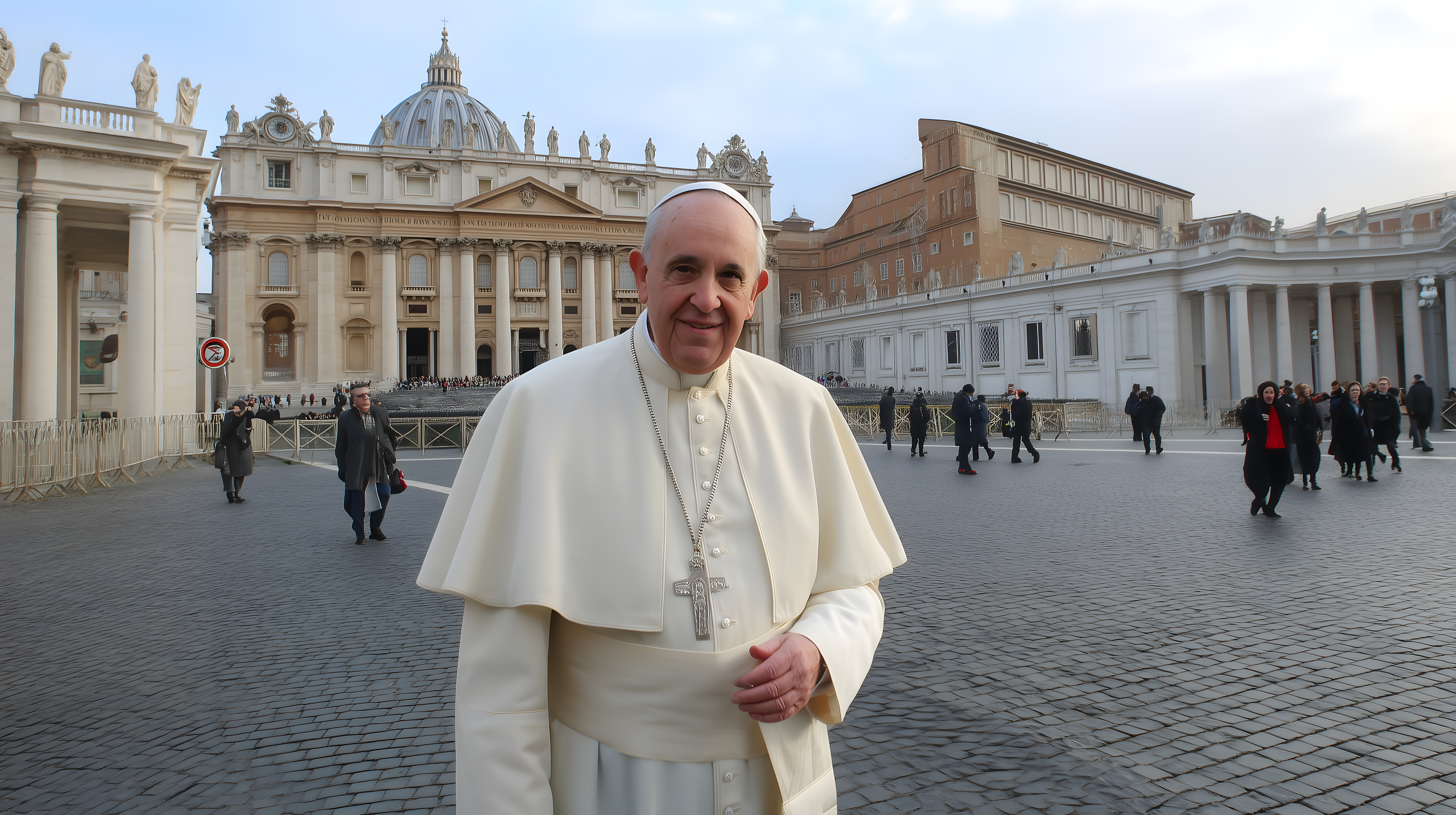 Das Foto zeigt Papst Franziskus, das geistliche Oberhaupt der römisch-katholischen Kirche, auf dem Petersplatz im Vatikan. Er trägt die traditionelle päpstliche Robe und Kopfbedeckung und lächelt freundlich in die Kamera. Im Hintergrund ist die berühmte Basilika St. Peter und andere Gebäude des Vatikans zu sehen. Der Platz ist von Touristen bevölkert, die die Sehenswürdigkeit besuchen. Das Foto vermittelt einen Eindruck der historischen Bedeutung und Ausstrahlung des Vatikans als Zentrum des Katholizismus. Es eignet sich perfekt als kostenloses Stockfoto für Blogs, Newsletter oder Social-Media-Beiträge rund um Themen wie Reisen, Tourismus, Religion und Christentum in hoher Auflösung und unter Creative-Commons-Lizenz.