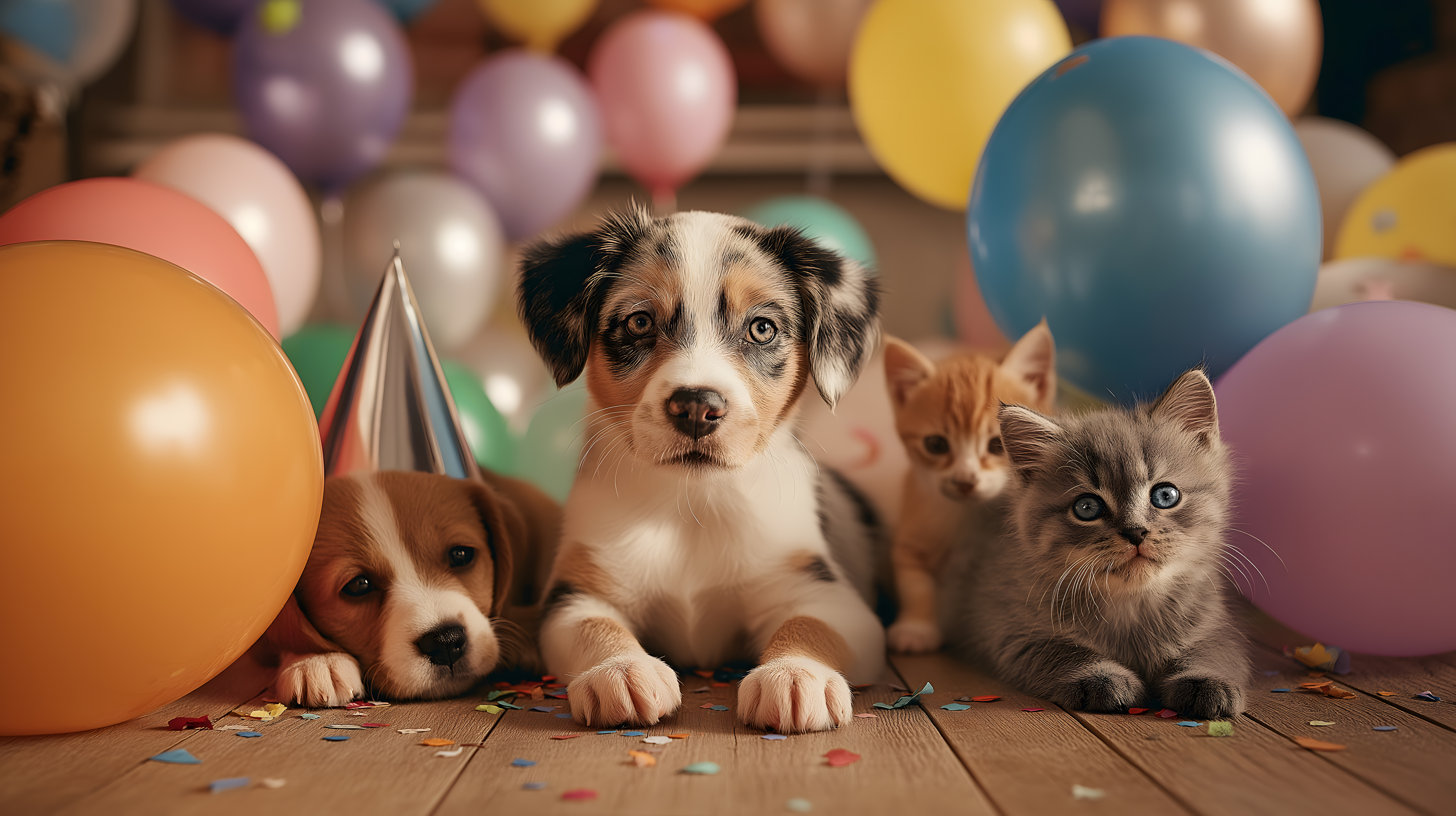 Dieses fröhliche Bild zeigt eine Gruppe von Welpen und Kätzchen, die offenbar eine Geburtstagsfeier mit bunten Luftballons und Partyhüten feiern. Die kleinen Haustiere sind auf einem Holzboden platziert, umgeben von bunten Luftballons in verschiedenen Farben. Die Komposition ist sorgfältig arrangiert, um eine einladende und fröhliche Stimmung zu erzeugen. Dieses kostenlose Stockfoto in hoher Auflösung unter der Creative-Commons-Lizenz eignet sich hervorragend für die Verwendung in Blogbeiträgen, Newsletter-Designs, Social-Media-Posts oder Werbekampagnen, die ein süßes und fröhliches Thema transportieren möchten.