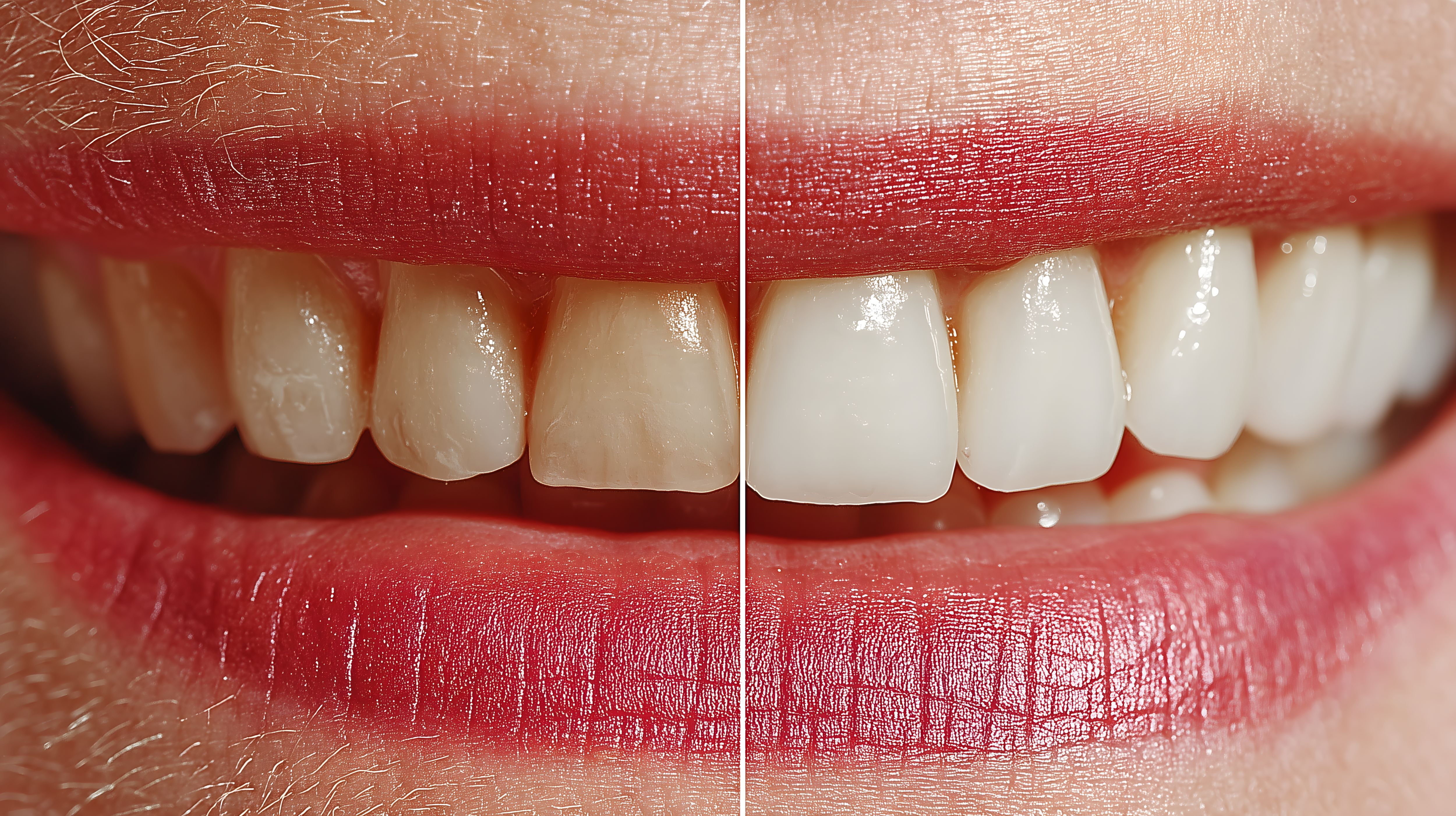 Dieses Foto zeigt einen Vergleich der Zähne vor und nach einer Zahnaufhellung. Die obere Hälfte des Bildes zeigt die Zähne in einem gelblichen Farbton, während die untere Hälfte die gleichen Zähne in einem strahlend weißen Zustand zeigt. Die Aufhellung lässt die Zähne frischer, gesünder und attraktiver erscheinen. Dieses Stockfoto eignet sich hervorragend für Beiträge zu Themen wie Zahngesundheit, Schönheitsbehandlungen, Produkttests oder Werbekampagnen in den Bereichen Gesundheit, Kosmetik und Wellness. Das hochauflösende Bild ist unter einer Creative-Commons-Lizenz frei verwendbar.