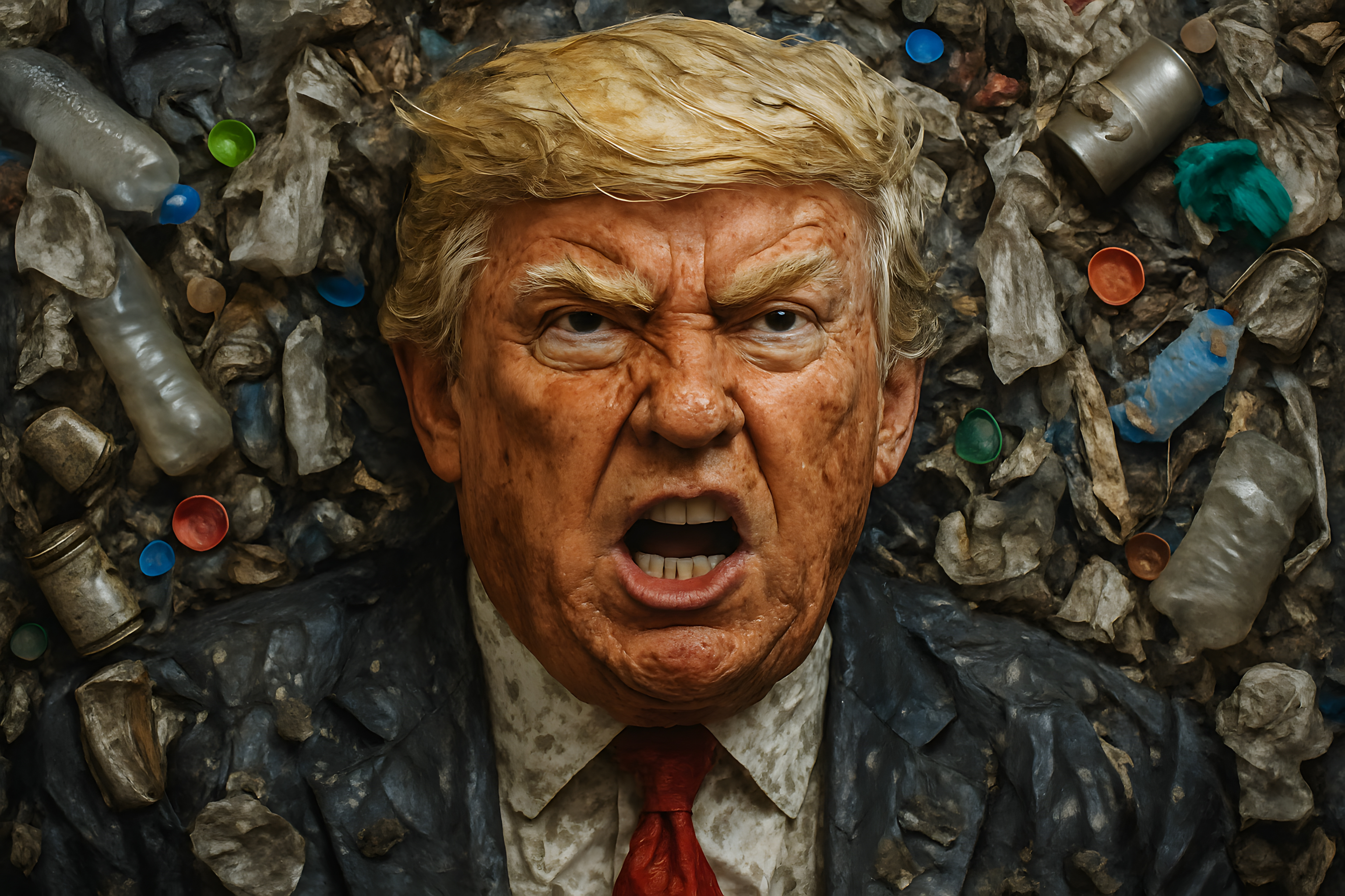 Dieses Foto zeigt eine Karikatur des ehemaligen US-Präsidenten Donald Trump, der inmitten von Plastikabfall und anderen Umweltverschmutzungsrelikten dargestellt ist. Der wütende Gesichtsausdruck und die aggressive Körpersprache vermitteln den Eindruck einer Kritik an der Politik und dem Umgang mit Umweltthemen. Das Bild kann als Satire oder Kommentar zur Umweltpolitik interpretiert werden und eignet sich für Blogs, Newsletter, Social-Media-Beiträge oder Werbung, die sich mit Themen wie Nachhaltigkeit, Umweltschutz oder Kritik an der Politik auseinandersetzen. Das hochauflösende, kostenlose Stockfoto steht unter einer Creative-Commons-Lizenz zur Verfügung.
