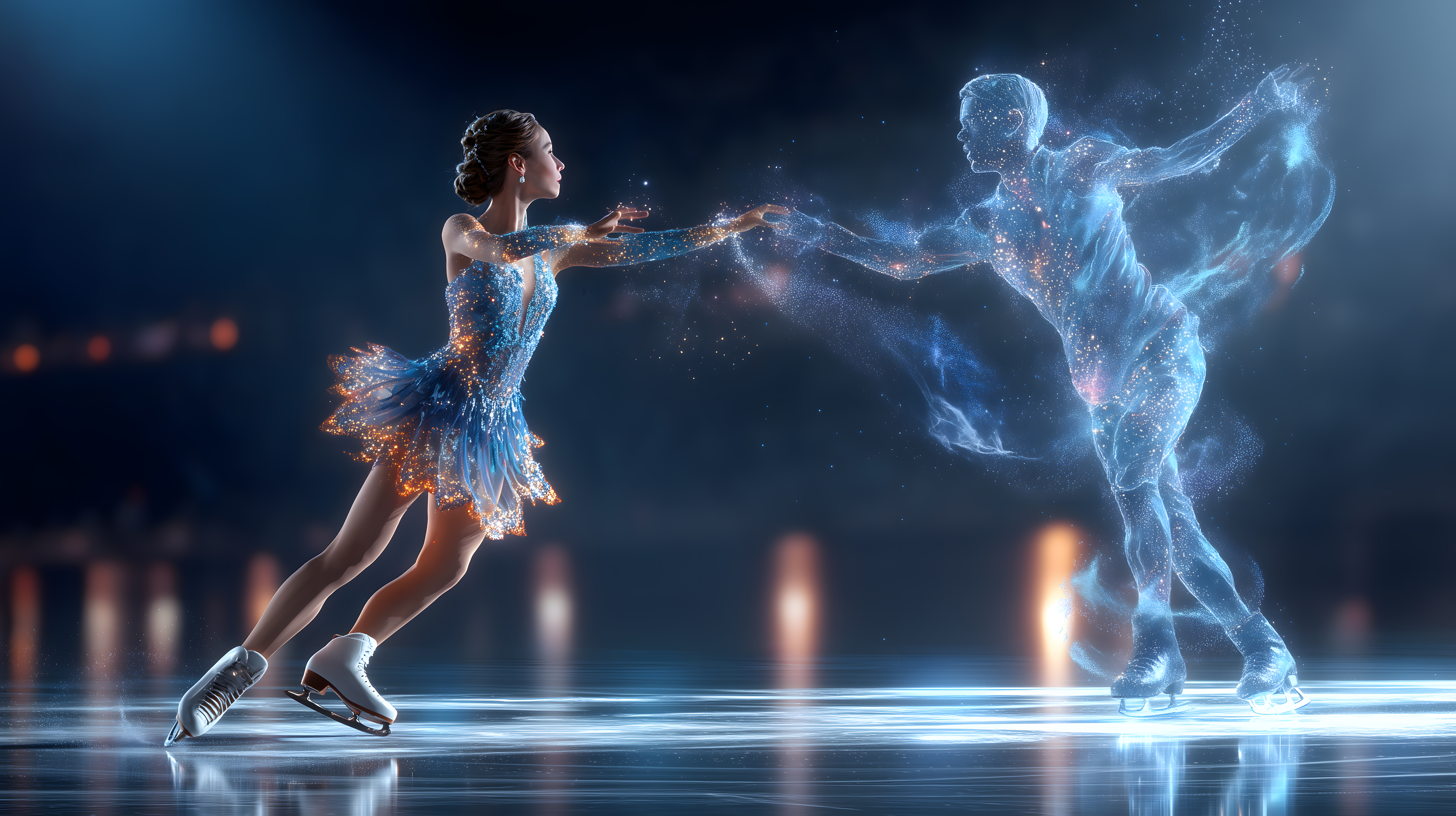 Das Bild zeigt eine eindrucksvolle Eiskunstläuferin in einem funkelnden, farbenfrohen Kostüm, die eine dynamische und elegante Performance auf der Eisfläche darbietet. Ihr Tanzpartner ist in blaue, durchscheinende Energie-Effekte gehüllt und scheint fast schwebend neben ihr zu agieren. Die Komposition und Beleuchtung erzeugen eine faszinierende, fast mystische Stimmung, die den Betrachter in ihren Bann zieht. Dieses hochauflösende Stockfoto eignet sich hervorragend für Blogs, Newsletter, Social-Media-Beiträge oder Werbematerialien rund um das Thema Eiskunstlauf, Winter-Events oder künstlerische Darbietungen. Das Foto ist unter einer Creative-Commons-Lizenz frei verwendbar.