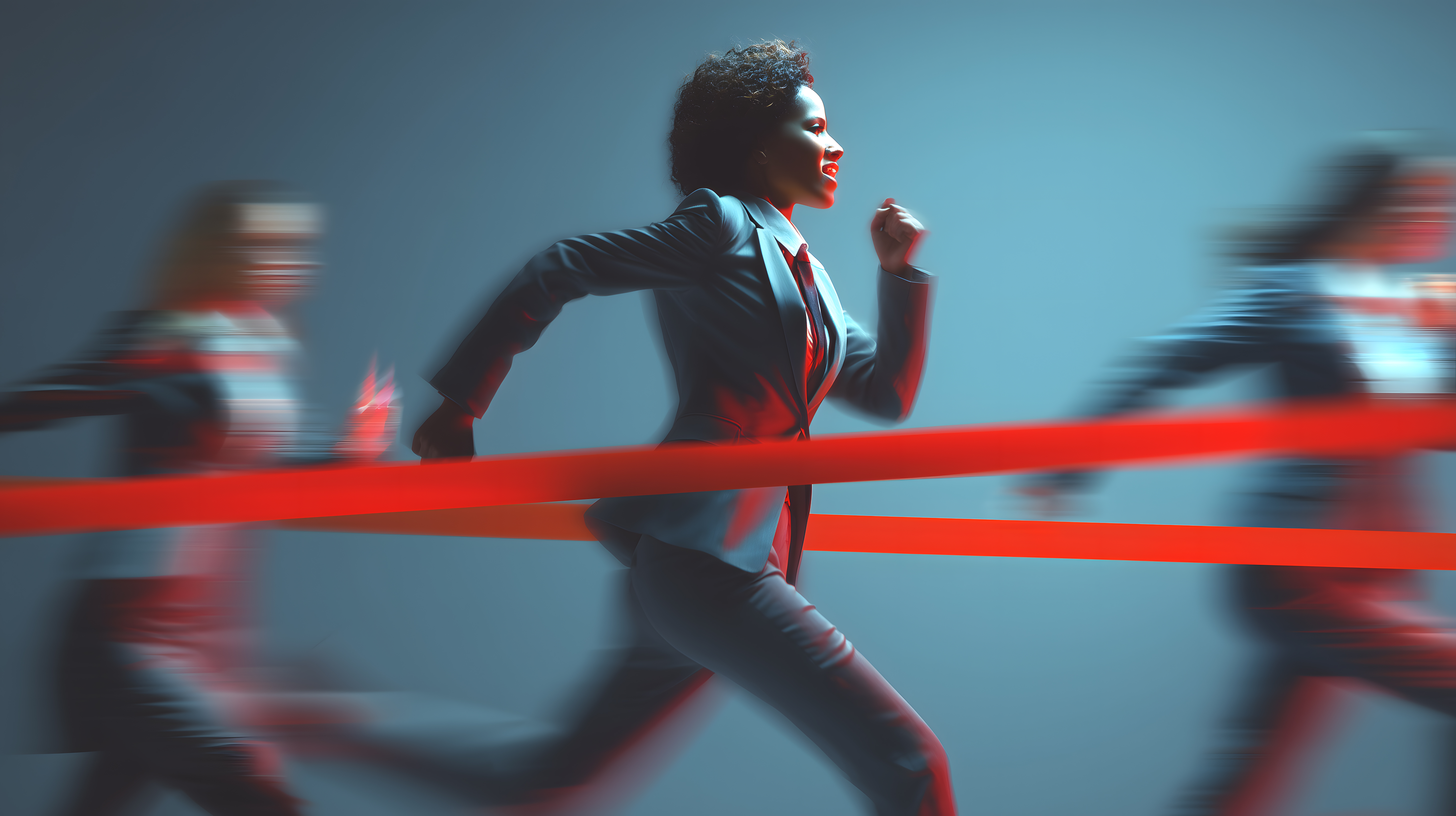 Das Bild zeigt eine dynamische und entschlossene Geschäftsfrau, die in Hochgeschwindigkeit eine rote Ziellinie durchbricht. Ihre Silhouette ist in kräftigen Farben wie Blau und Rot vor einem verschwommenen Hintergrund zu sehen, was den Eindruck von Kraft und Energie vermittelt. Die Komposition mit der Frau im Mittelpunkt und den verwischten Elementen im Hintergrund verleiht dem Bild eine moderne und künstlerische Ästhetik.