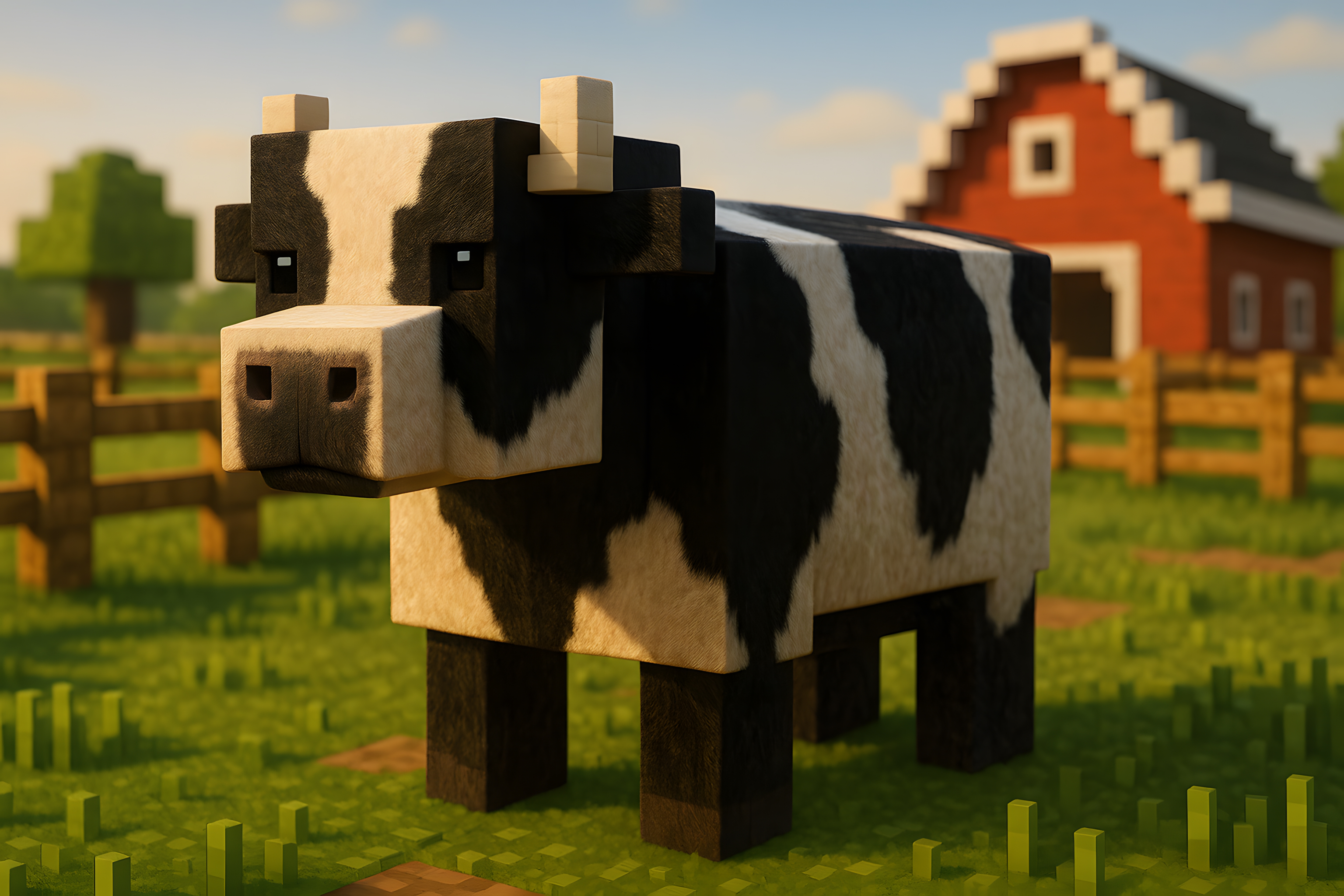 Dieses Bild zeigt eine Kuh in einem Minecraft-artigen Stil, die auf einem Bauernhof inmitten einer ländlichen Landschaft steht. Die Kuh hat einen kubischen, pixeligen Look mit schwarz-weißer Fellzeichnung. Im Hintergrund sind ein roter Stall und ein Holzzaun zu sehen, umgeben von grünen Wiesen und Bäumen.