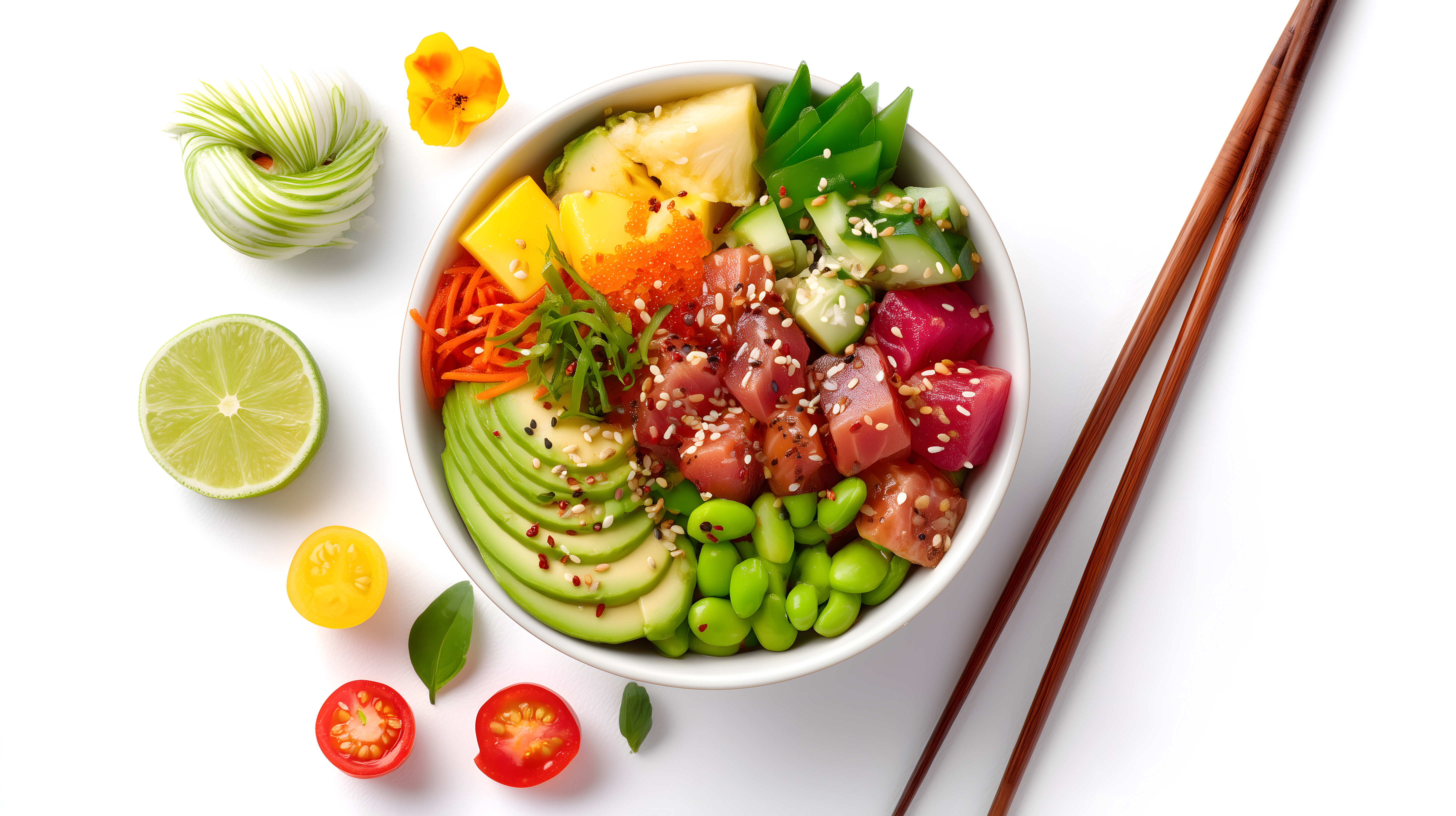 Diese einladende Poke-Schüssel zeigt eine bunte Vielfalt an frischen Zutaten. Im Mittelpunkt steht ein Medley aus Avocado, Ananas, Karotten, Edamame und anderen knackigen Gemüsesorten, die zusammen mit mariniertem Thunfisch oder Lachs ein geschmacksintensives und vitaminreiches Gericht ergeben. Die Zubereitung erfolgt vor weißem Hintergrund, wodurch die leuchtenden Farben und appetitliche Präsentation optimal zur Geltung kommen. Dieses hochwertige Stockfoto in hoher Auflösung eignet sich hervorragend für die Verwendung in Blogs, Online-Shops, Werbekampagnen oder Social-Media-Beiträgen rund um gesunde Ernährung, Fitness und Foodfotografie. Die Lizenz unter Creative Commons ermöglicht eine vielseitige, kostengünstige Nutzung.