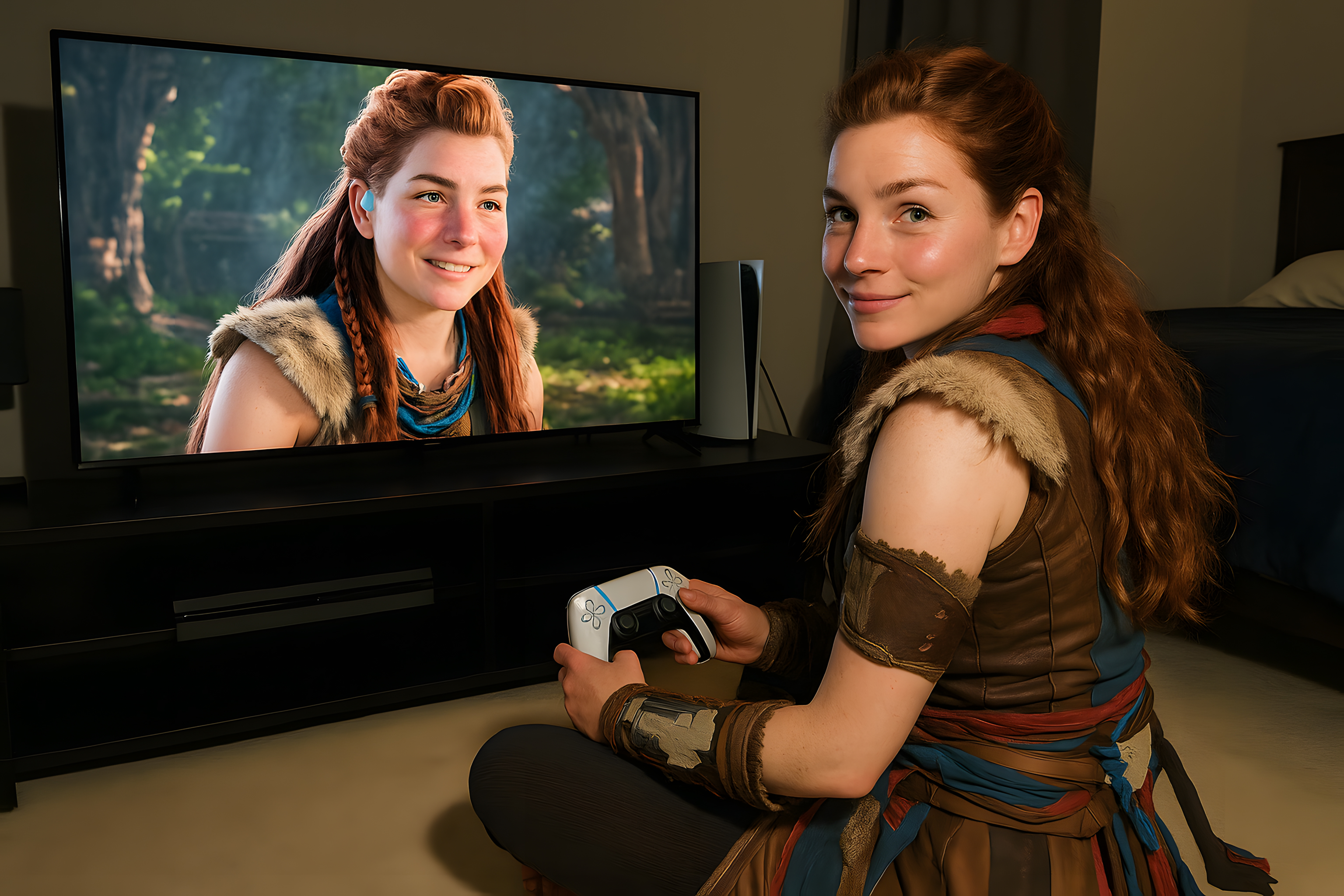 Das Bild zeigt eine junge Frau, die auf einer Couch sitzt und ein Videospiel auf einem großen Bildschirm spielt. Sie hält einen PS5-Controller in den Händen und lächelt in die Kamera. Im Hintergrund ist eine Landschaftsszene aus dem Spiel Horizon zu sehen. Das Foto vermittelt einen Eindruck vom modernen Lifestyle und der Faszination für digitale Unterhaltung. Es eignet sich hervorragend als kostenloses Stockfoto in hoher Auflösung für Blogs, Social-Media-Posts oder Werbekampagnen rund um Gaming, Lifestyle und Freizeitgestaltung.