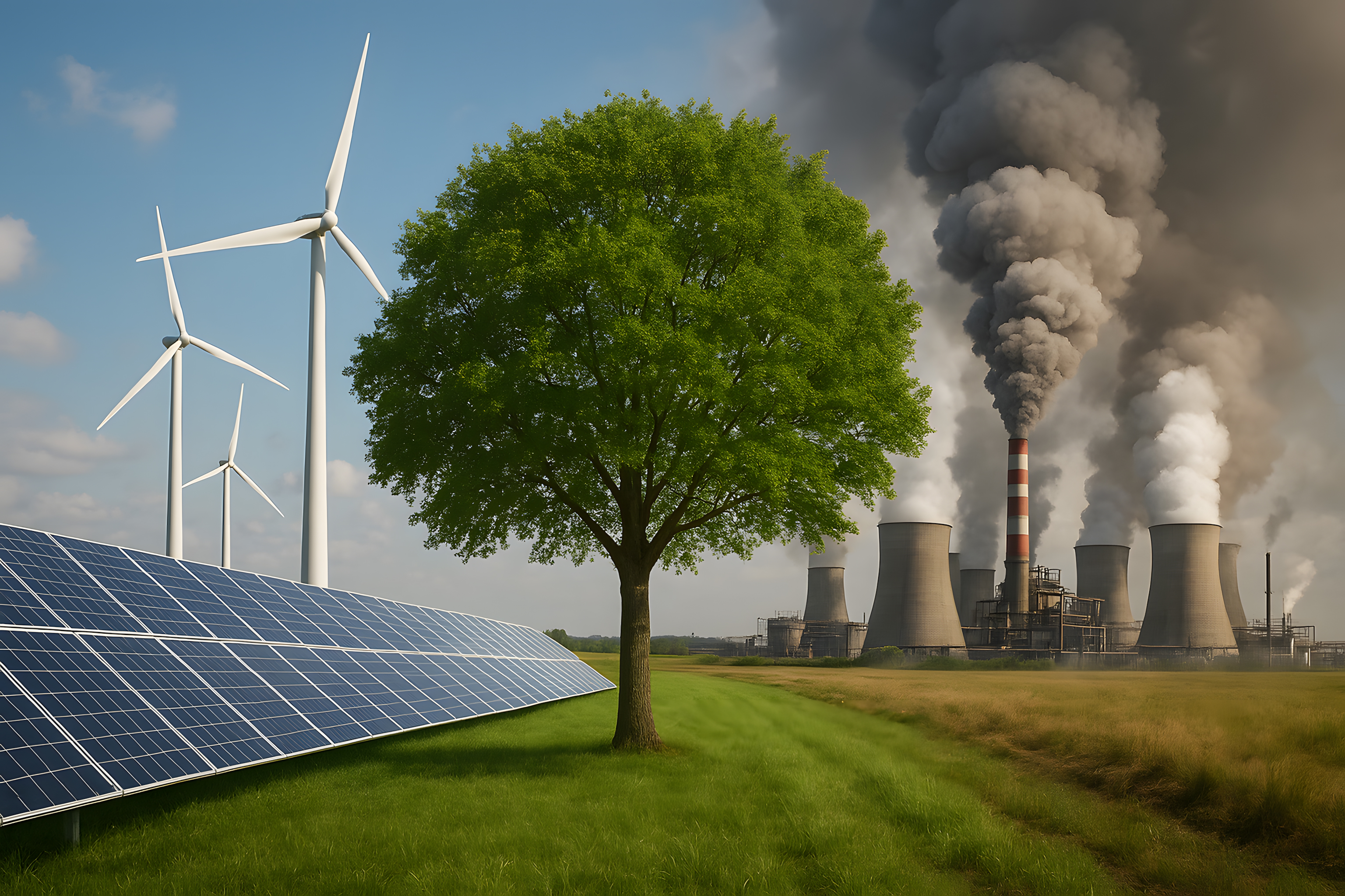 Dieses Bild zeigt einen harmonischen Kontrast zwischen erneuerbarer und konventioneller Energieproduktion. Im Vordergrund sehen wir eine große Solaranlage und Windräder, die saubere Energie erzeugen. Im Hintergrund ragt jedoch auch ein Kohlekraftwerk mit rauchenden Schornsteinen in den Himmel. Die Natur ist dabei durch einen prächtigen Baum vertreten, der die beiden Welten miteinander verbindet. Das Foto veranschaulicht den Übergang von fossilen zu erneuerbaren Energien und die Herausforderungen, die damit einhergehen. Das Bild eignet sich hervorragend als kostenloses Stockfoto für Blogs, Newsletter oder Social-Media-Beiträge zum Thema Umweltschutz, Energiewende und nachhaltiger Fortschritt. Es liegt in hoher Auflösung unter einer Creative-Commons-Lizenz vor.
