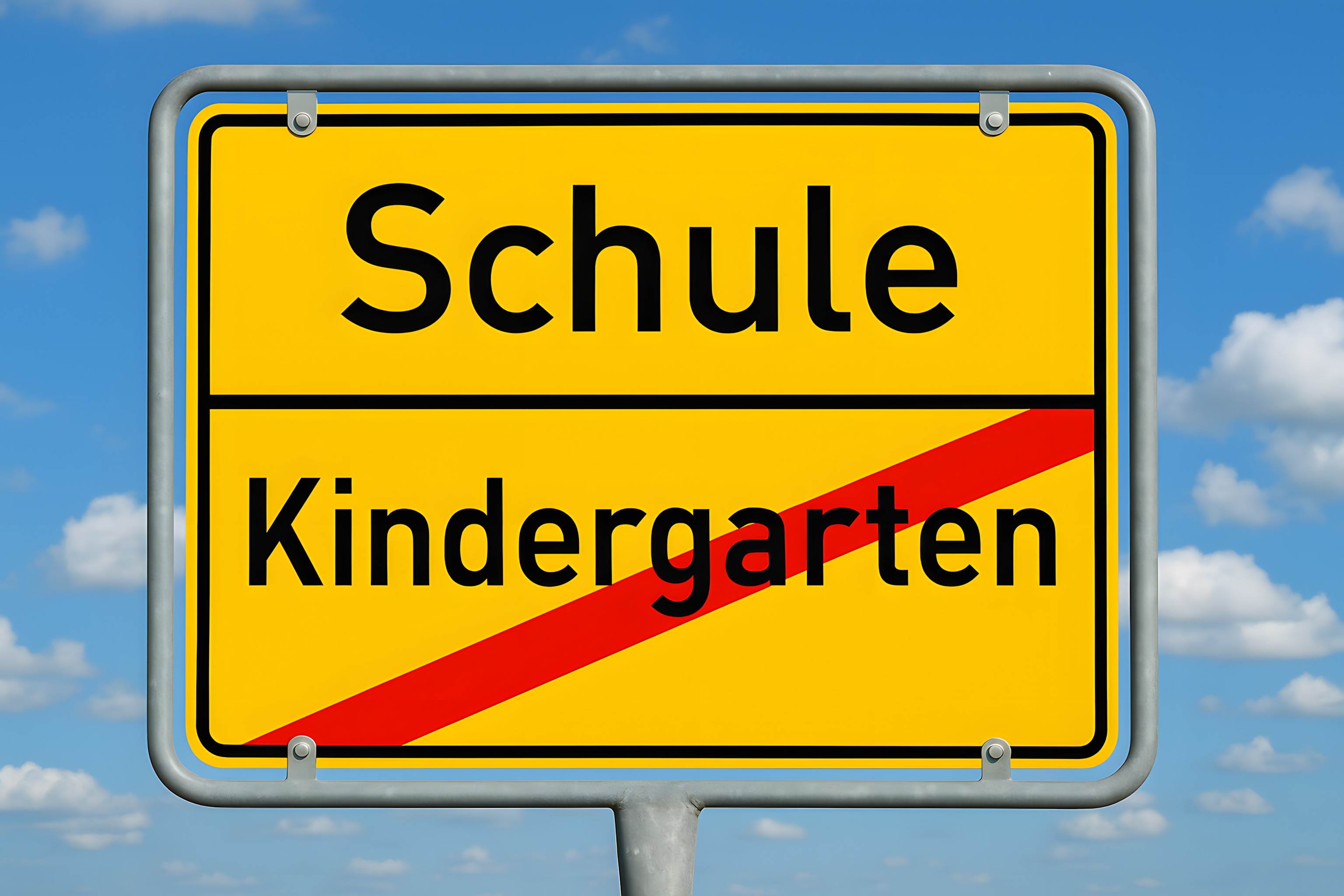 Das Bild zeigt ein Ortsschild mit der Aufschrift 'Schule' und 'Kindergarten'. Das Schild ist in den Farben Gelb und Rot gehalten, was typisch für Verkehrsschilder ist. Es ist vor einem bewölkten, blauen Himmel aufgestellt, was eine ruhige, ländliche Umgebung suggeriert. Das Foto eignet sich hervorragend als kostenloses Stockfoto für Blogs, Newsletter, Social-Media-Beiträge und Werbematerial rund um die Themen Bildung, Lernen und Infrastruktur in Gemeinden. Die hochauflösende Datei steht unter einer Creative-Commons-Lizenz zur Verfügung.